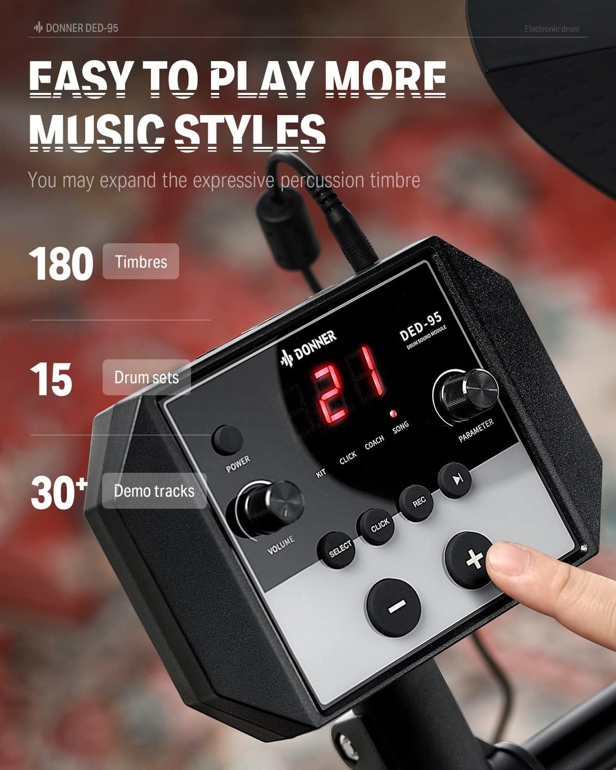 Both DED-80P and DED-95 are new electronic drum kits that are great for beginners as well as any drummer looking for a simple and quiet practice solution. With 180 built-in tones, 15 drum sets and 30 demo songs, young players will explore a variety of music genres with these portable drum kits, which also offer premium features including toms with 7-inch double layer mesh pads, cymbals with 10-inch Single-Zone Iron rod support.