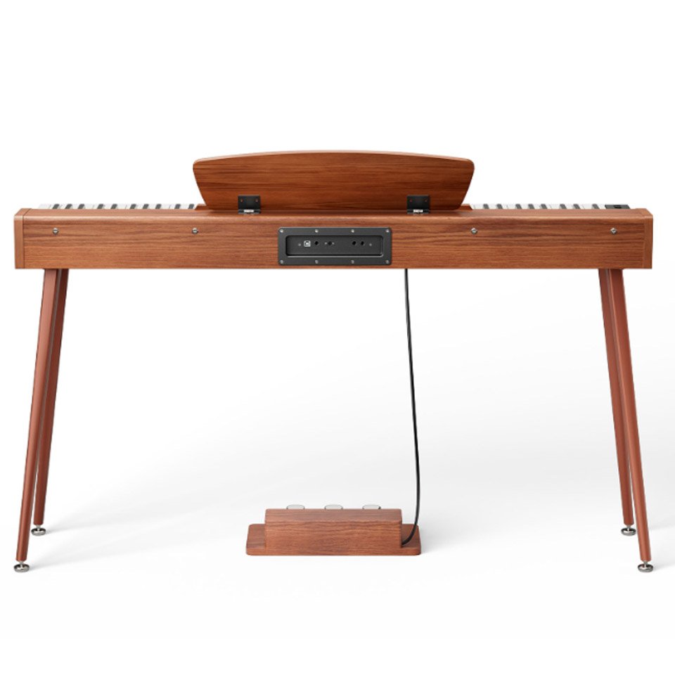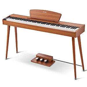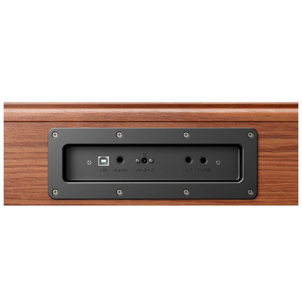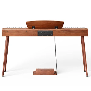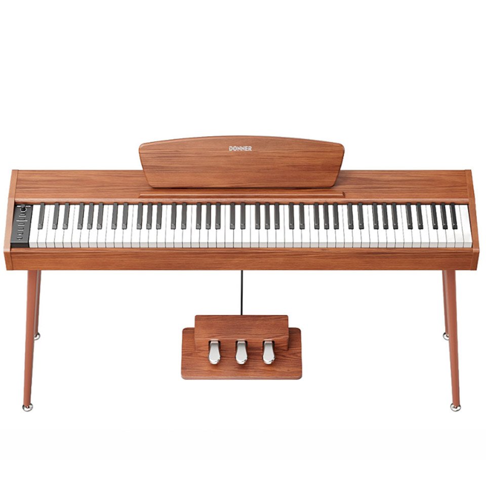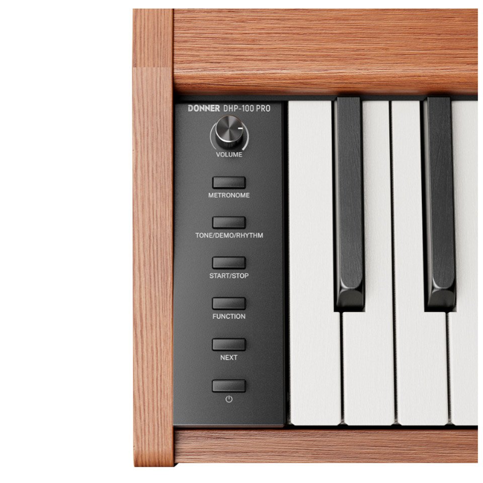 The Donner DHP-100 Pro Wood is an elegant electric piano with a Scandinavian, minimalist wooden design. With its touch-sensitive, lightweight 88 keys in real piano size, it offers a user-friendly and authentic playing feel for beginners. The sample-based sound generator provides a rich sound image with 128-voice polyphony, and there are 4 different touch curves to choose from. It has practical functions such as Dual and Split modes, a metronome and a sequencing function — so you can capture musical ideas. With 83 rhythms and 47 demo songs, you have plenty of sound possibilities. The two-way speaker system (2 × 15 W) provides clear and powerful sound. Connections for headphones, line output and USB make it easy to integrate the piano into your music setup.