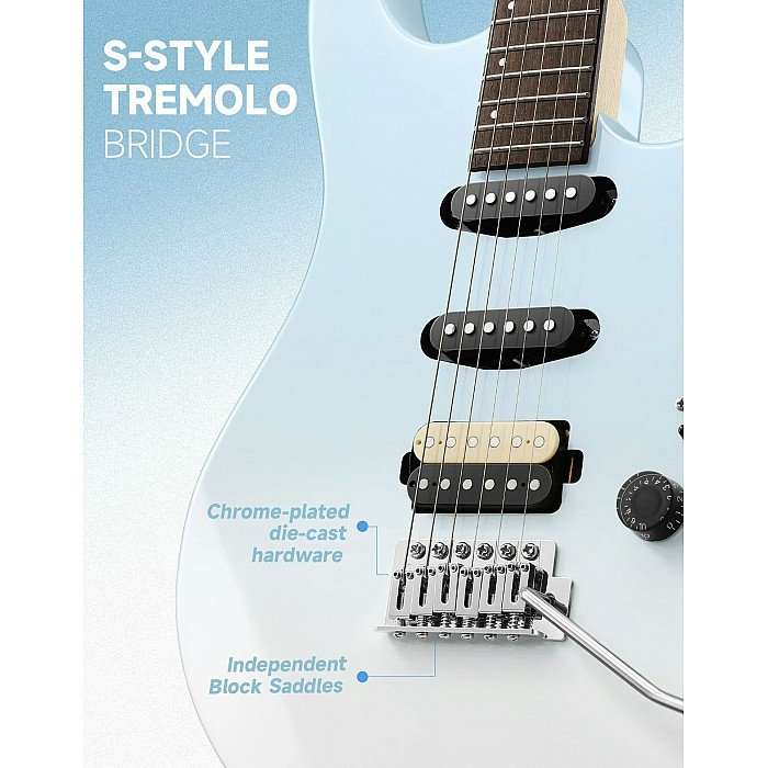 Equipped with DONNER LAB's self-developed DMT Midout Set pickups in HSS configuration, it delivers stable output suitable for genres from blues to high-gain, providing precise tonal control for refined sound. Designed with a slim C-shaped neck optimized for fast, comfortable playing, combined with carefully crafted contours, ensuring a smooth and fatigue-free experience for both beginners and advanced players. Constructed from well-seasoned poplar wood, the body delivers stable, reliable performance with rich tones. The Indian laurel fingerboard and 22 medium frets offer enhanced playability and comfort for extended sessions.