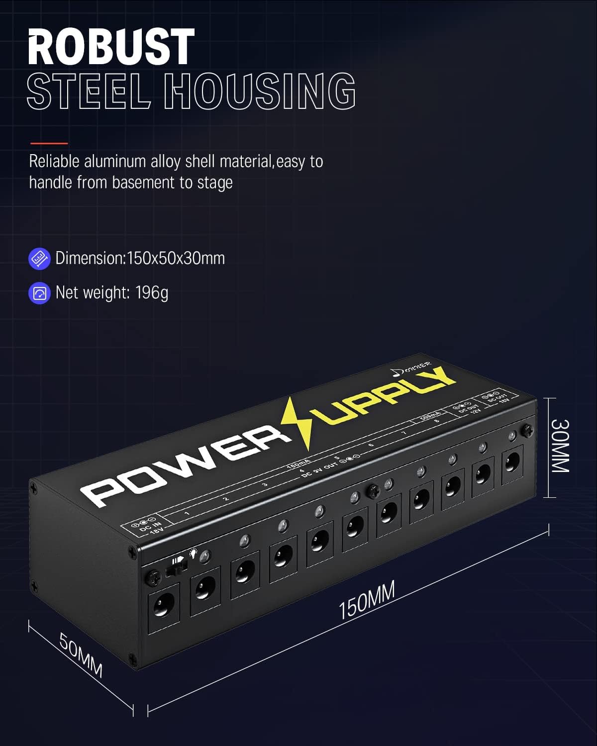 The power supplies of the Donner series of effects have absolutely independent power interfaces. It has an 18V power supply, and all outputs are independent of each other through its voltage regulator circuit. The aluminum alloy material is strong and compact and easy to carry.