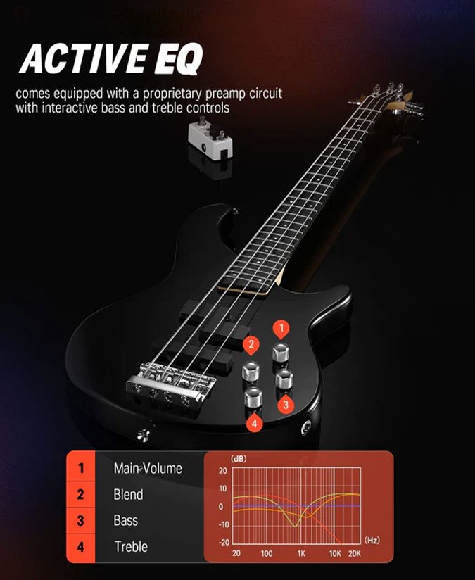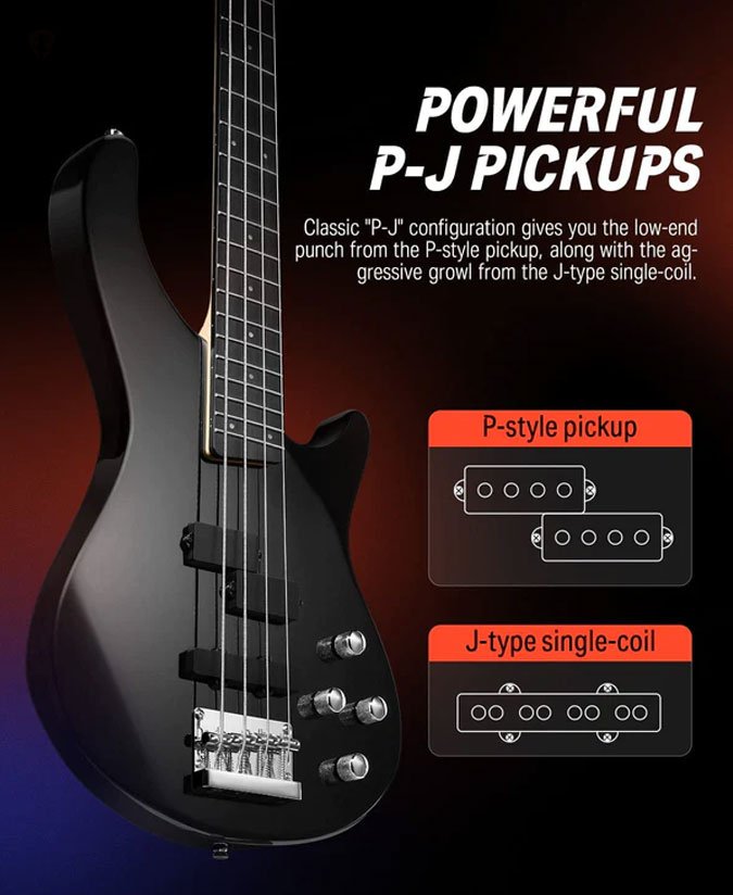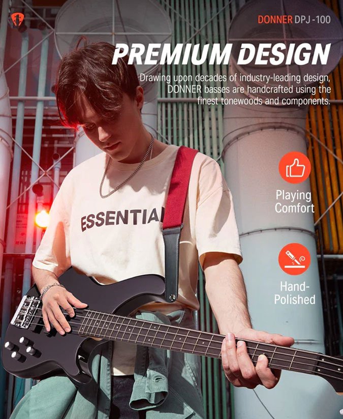 The Donner DPJ-100 Electric Bass Guitar features a modern neck designed for comfort and performance, with a slim “C” profile (the shape of the neck in cross-section) and a smooth satin back. Black Sealed Pickups with Active Preamp Levels give you more power and stability in your playing. In addition to other cool features, the Donner DPJ-100 Bass features the added elegance of a matching custom-cut headstock finish. You have the powerful sound shaping and noise control capabilities of the DONNER Custom 4-band EQ preamp. The preamp gives you control over tone, master volume, bass, and high frequencies — this instrument's incredible electronics will get you there quickly.