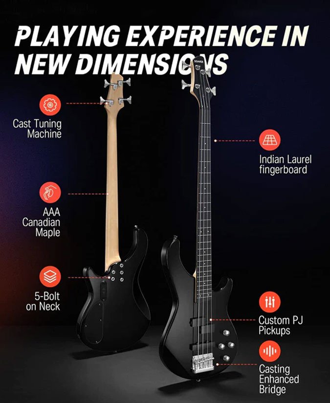 To give the DPJ-100 electric bass a strong sonic foundation, we equipped it with a pair of Custom PJ-Style pickups to give you the fat, punchy tone and wide range of sound you want plus incredible playability – all for an incredible low end price. ! Casting Enhanced Bridge increases definition and sustain, each saddle allows energy to transfer efficiently between strings and body. The maple neck with a slim profile feels great and gives you fast playing action. The compact, contoured poplar body makes longer playing sessions extra comfortable.