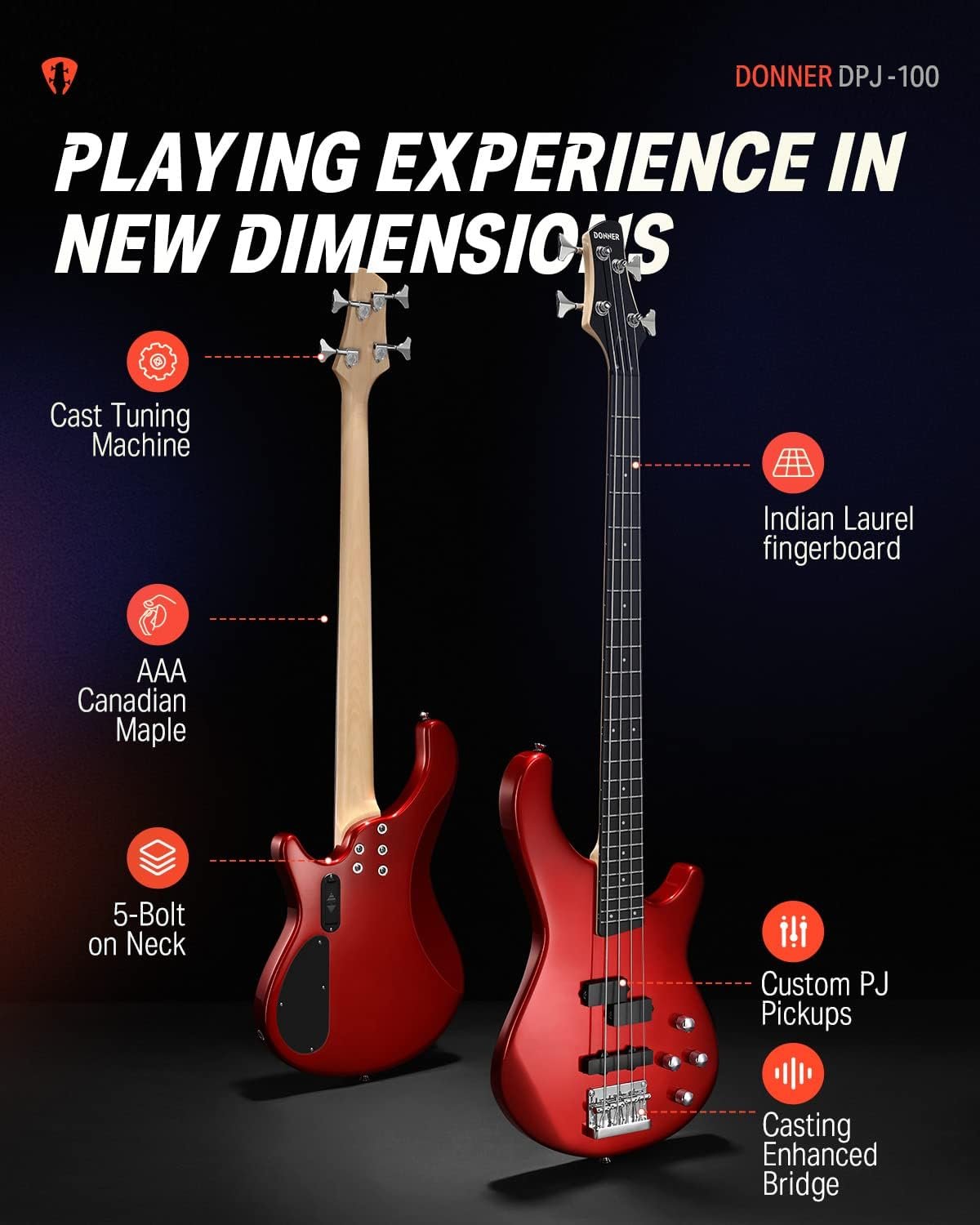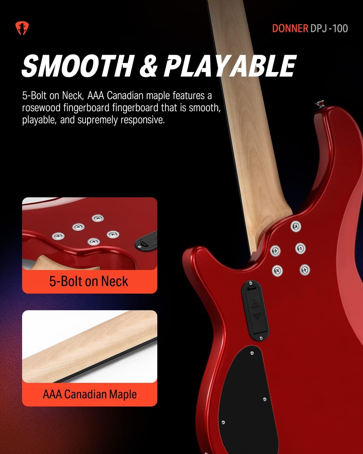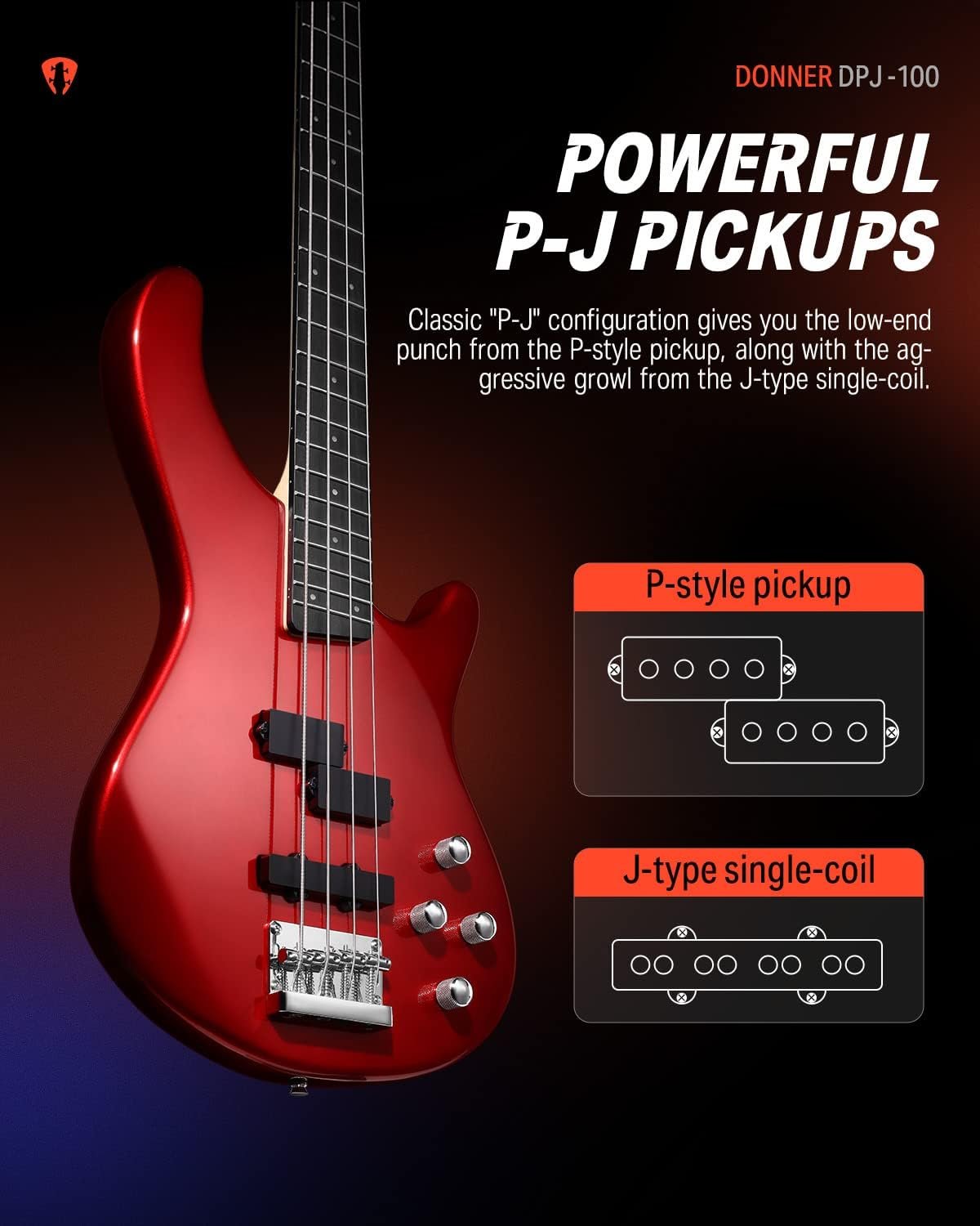 The Donner DPJ-100 Electric Bass Guitar features a modern neck designed for comfort and performance, with a slim “C” profile (the shape of the neck in cross-section) and a smooth satin back. In addition to other cool features, the Donner DPJ-100 Bass features the added elegance of a matching custom-cut headstock finish. You have the powerful sound shaping and noise control capabilities of the DONNER Custom 4-band EQ preamp. The preamp gives you control over tone, master volume, bass, and high frequencies — this instrument's incredible electronics will get you there quickly. To give the DPJ-100 electric bass a strong sonic foundation, we equipped it with a pair of Custom PJ-Style pickups to give you the fat, punchy tone and wide range of sound you want plus incredible playability – all for an incredible low end price. ! Casting Enhanced Bridge increases definition and sustain, each saddle allows energy to transfer efficiently between strings and body.