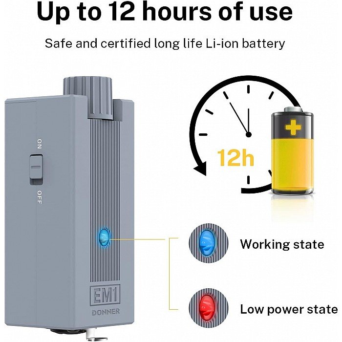 Donner EM1 is a rechargeable and portable personal in-ear monitor amplifier specially designed for stage musicians. The outstanding technical, sonic characteristics, high audio reproduction and no audio rendering were translated into a more compact format to EM1, so that you can clearly hear the sound of playing on stage anytime and anywhere. Whether you're a drummer, keyboard player, Vocal, or other musicians, EM1 is an excellent stage partner. Meanwhile, EM1 is also applied to practicing instrument, studio recording as audio monitor with high power and volume. With Micro USB Type C jack,connects the cable of Micro USB Type C for charging, DC 5V, 1A above current. The LED indicator will show red indicating it is charging. 1/8” TRS headphone output, for connecting the headphone. It is recommended to use 8 Ω - 250Ω impedance headphones, in order to obtain better result.C