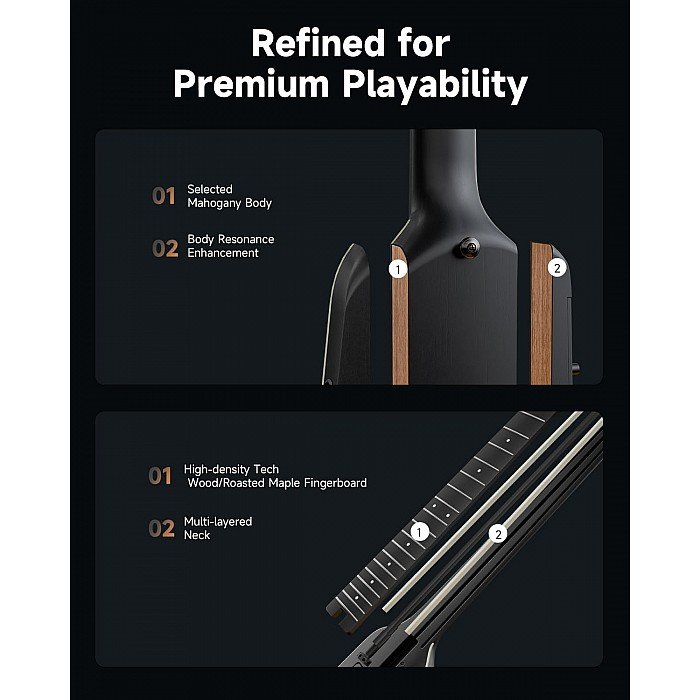 HUSH™ X Pro will become a one-stop solution for electric guitar players' equip- ment chain, liberating guitarists who are bound by equipment. The DXP System (with built-in effects) has extremely high playability, and can ensure the player's comfortable experience even after long-term practice. Available finishes include Knight Black and Metallic White. Fingerboard options are high-grade roasted maple (White) or high-density engineered wood (Black), with rounded stainless steel frets. Other specifications include an integrated mahogany neck-through design, a fingerboard made of roasted maple/high-density engineered wood, output ports (6.35mm, 3.5mm, USB-C), and a built-in rechargeable lithium battery. The HUSH-X Pro has 18 preset slots, 4 electric guitar simulations, and 3 acoustic guitar simulations, making it adaptable to various playing situations. The guitar also features 10 IR slots and Donner Labs proprietary H-S Alnico V Pickups configuration.