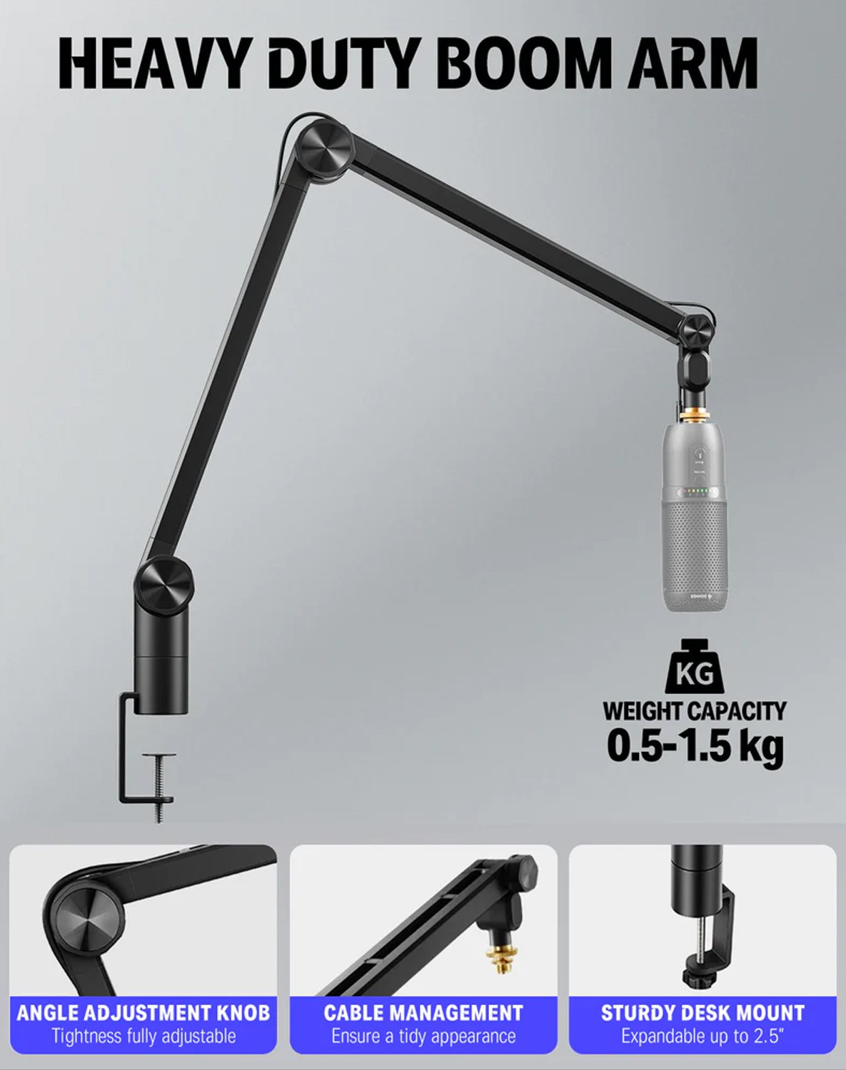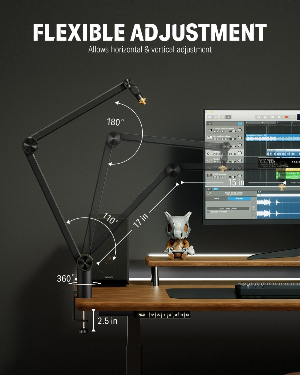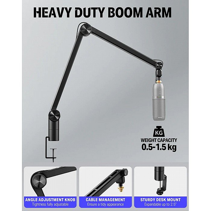 Up to 2.5 inches clip desk clamp attached for you to mount the microphone arm on your table much stable and reduce unwanted sound due to vibration. The raised spring tension screw on the side of the arm allows you to set the MS-1 microphone stand to a comfortable angle effortless. Stable Adjustable Mic Stand - Up to 2.5 inches clip desk clamp attached for you to mount the microphone arm on your table much stable and reduce unwanted sound due to vibration. The raised spring tension screw on the side of the arm allows you to set the MS-1 microphone stand to a comfortable angle effortless. Ideal Choice for Widely Application - No matter you are a streamer, a Youtuber, a recording artist, or a podcaster, a portable sturdy boom arm mic stand will hold your microphone well without disturbing your setup or catching all of that unwanted background noise.