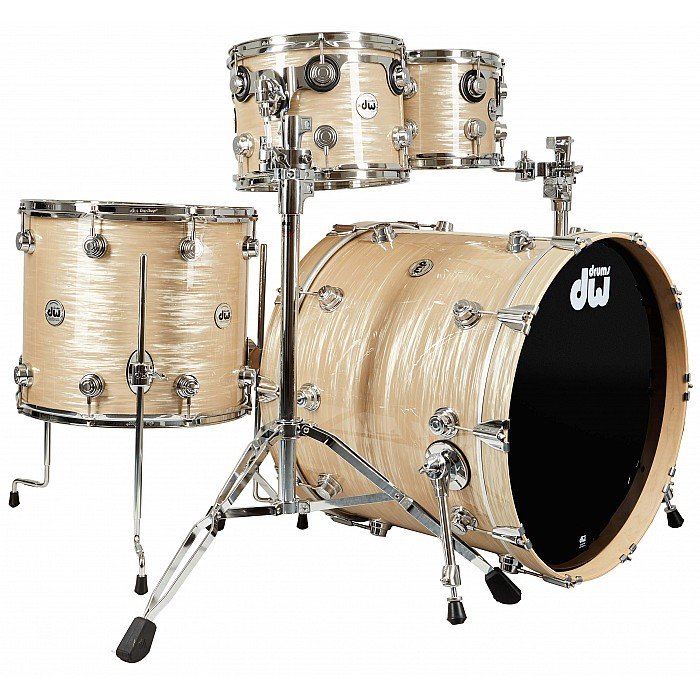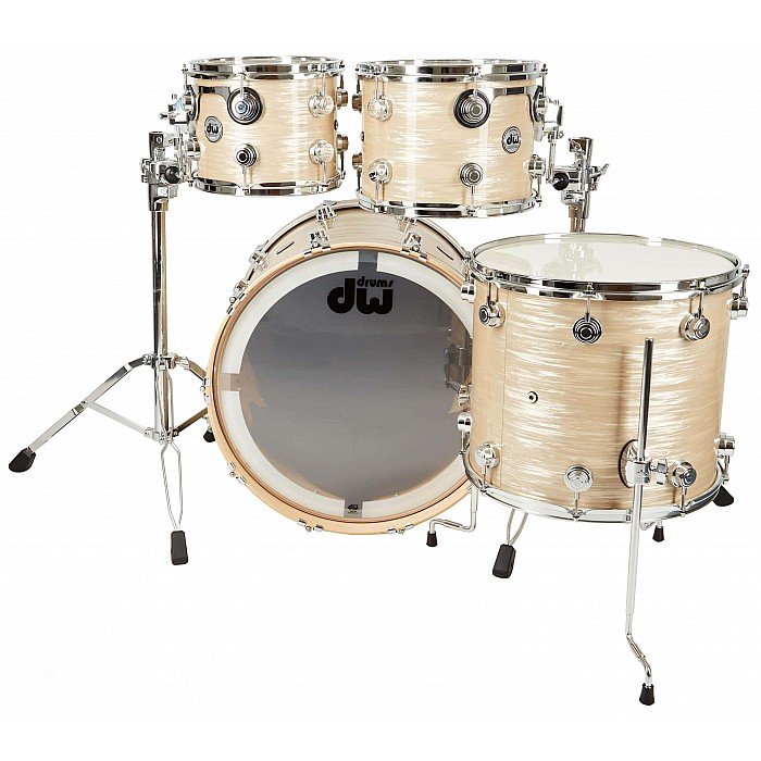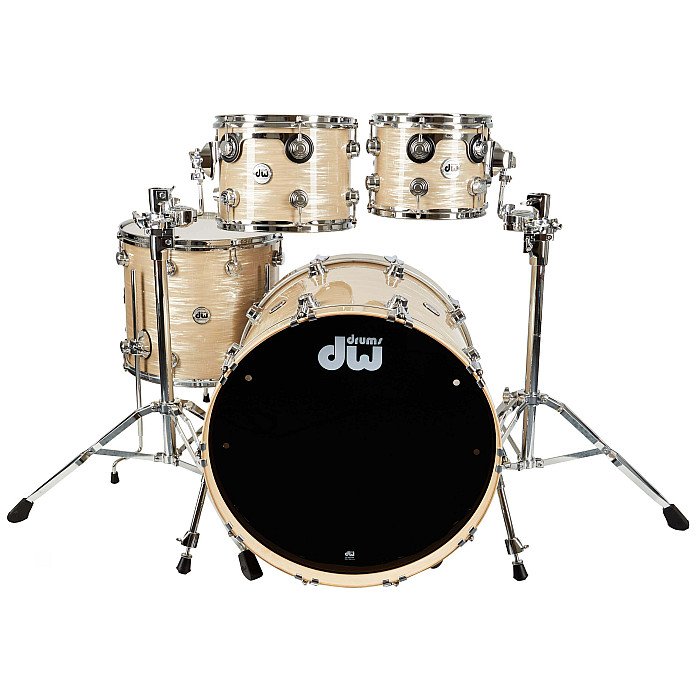 This Collector's Series drum set includes a bass drum, two toms and one floor tom. The set has bodies made entirely of maple, which is very popular for drum set making due to its strong resonance and punchy attack. The patented Suspension Tom Mount allows for maximum resonance of the wood while providing stability and secure suspension. Tuning screws with denser thread layering (up to 20% more than standard screws) allow maximum control over the sound of the kit. The hand finish is one of the features that make DW's name. In this case, it is the specific FinishPly finish in Créme Oyster. The hardware is completely chrome plated.