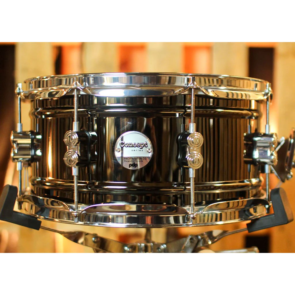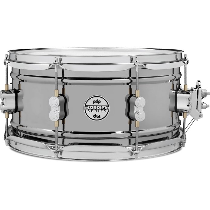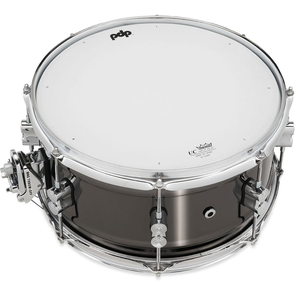 The Concept Series Black-Nickel-Over Steel Snares offer drummers a brash, sleek-looking snare drum with a lower pitch, dynamic attack, and bright resonance that cut through any mix as a main or side snare. These drums feature a 1mm-thick, dual-beaded, rolled-steel shell, plated in a mirror-like, black nickel finish. Each of these drums is fitted with PDP's dual-turret lugs, DW MAG throw-off and True-Pitch tension rods, and world-class drum heads from Remo. The snare wires are fully-chromed, with carbon steel coils and brass end plates, for exceptional texture and control. The Black Nickel Over Steel Snares are offered in variety of sizes to help you dial in your specific sound. The Concept Series Black Nickel Over Steel Snares are the singular, brash, sleek-looking quintet in PDP's family of Specialty Snare Drums. These drums are constructed from 1mm-thick, dual-beaded, rolled-steel shells, plated in a mirror-like, black nickel finish.