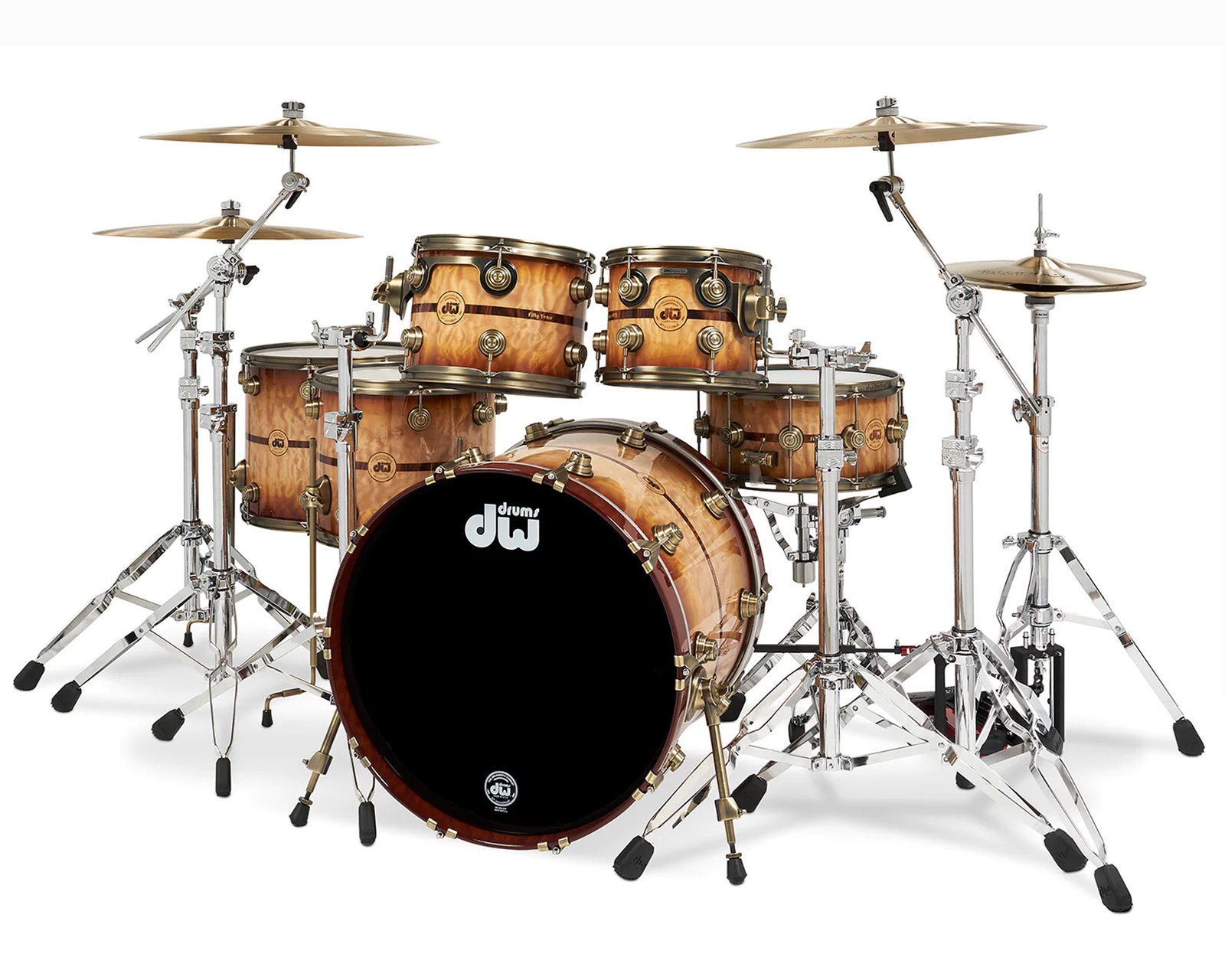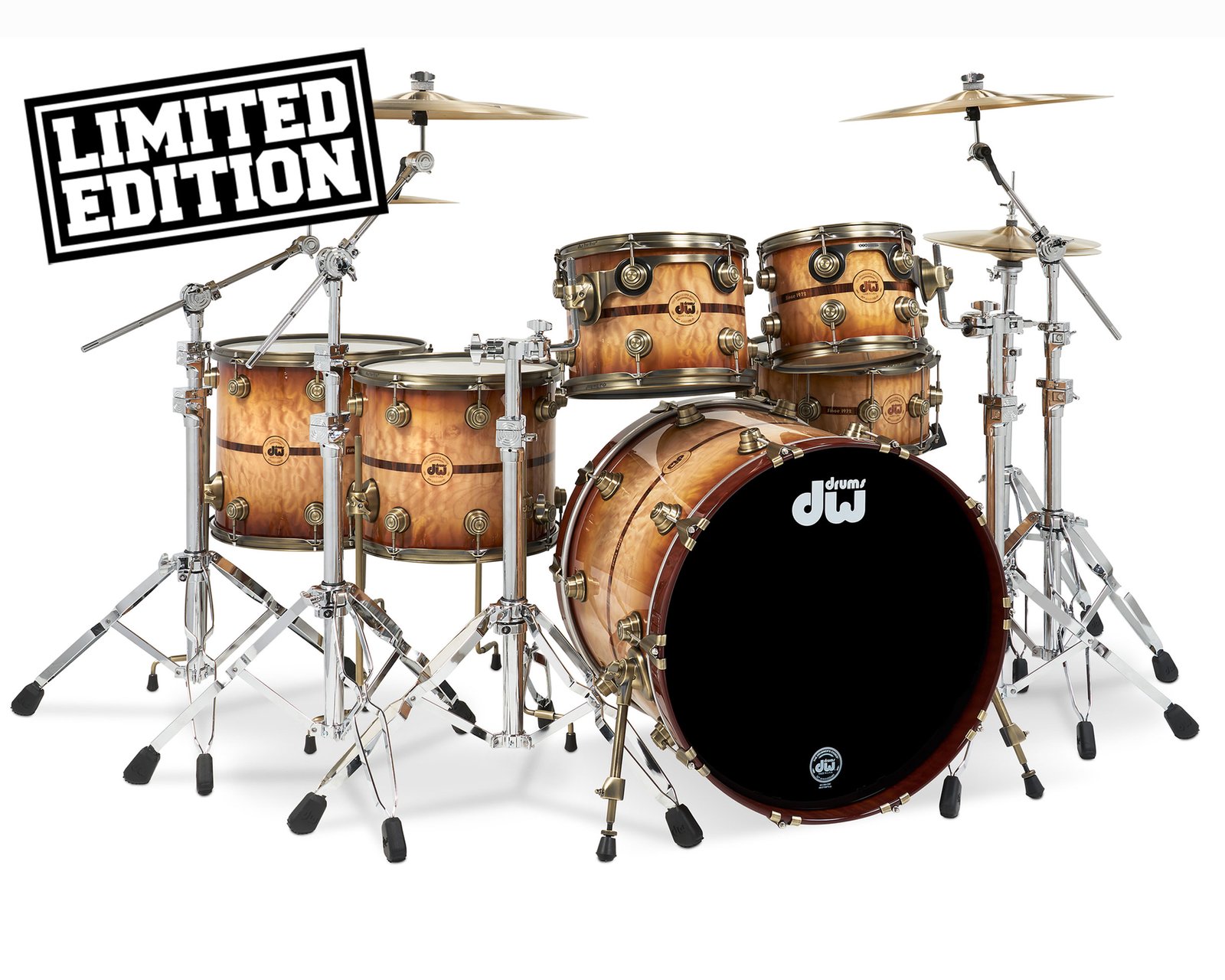 The DW 50th Anniversary Shell Set Limited Edition Collection is limited to only 100 sets worldwide and offers unique features and a spectacular finish. The six-piece shell set includes 10"x8" and 12"x9" toms, 14"x12" and 16"x14" floor Toms as well as a 22"x18" Bass Drum and matching snare Drum in 14"x6.5". The exclusive DW drum set features 50th Anniversary badges and a Quilted Maple outer layer adorned with Maple and Rosewood Inlays . The HVLT Hybrid Shells made of Persimmon and Spruce are finished with a Burnt Toast Burst Lacquer finish. The drums are made from a combination of Persimmon wood, a hard wood similar to Purpleheart that creates a dense attack and projection, and Spruce that enhances warmth and tonality
