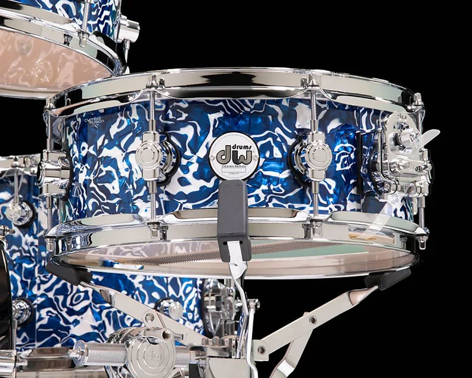 Unleash a storm of tone and style with the DW Design Series in Blue Lightning—a finish available only at CymbalFusion.com. This striking new look electrifies the stage with a bold, high-voltage blue and white Delmar finishply, infused with shimmering contrast that dances under the lights. It's modern, fierce, and unlike anything else in the Design Series lineup. Beyond the finish, you're getting the unmistakable DW craftsmanship: North American maple shells, HVLT (Horizontal Vertical Low Timbre) shell construction for enhanced resonance and low-end punch, and pro-level hardware appointments throughout.