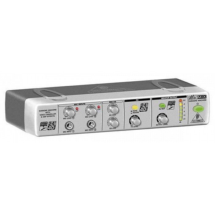 Sing along with the powerful MIX800 MiniMIX karaoke machine from Behringer! Its revolutionary voice canceller effectively eliminates vocals from any stereo source while retaining most music elements. The integrated digital echo/reverb processor in 24-bit/40kHz resolution assures ultimate vocal enhancement. Behringer includes 2 independent mic channels with level controls and clip indicators for perfect level adjustment. A dedicated 2-band EQ provides for awesome vocal enhancement and sound shaping, and the MiniMIX boasts an accurate 6-digit LED output meter for precise level indication.