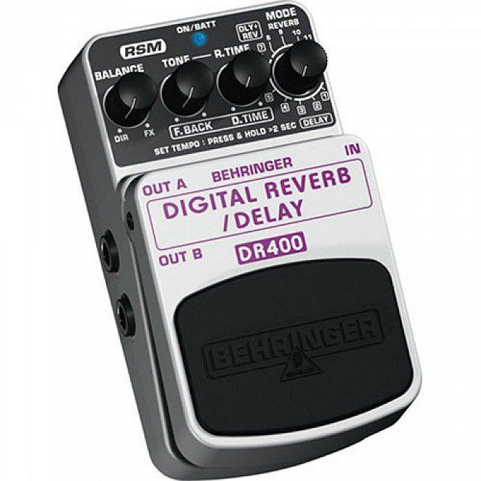 Delay is a synthetic echo that, in adjustable increments, repeats the notes you play on guitar. Each repeated tone becomes quieter than the previous one, until the repeats are no longer heard. This results in a thick, robust sound that can take on everything from the quick "slap" echo of classic rockabilly to the long, dreamy echoes found in psychedelic rock. On the other hand, reverb emulates the natural echo that occurs because of a room's acoustics. Think of how your guitar would sound if you plucked a note while standing in a big empty gymnasium - the DR400 can produce that sound, even if you're playing in your bedroom! It can even combine this sound with delay for a truly otherworldly tone.