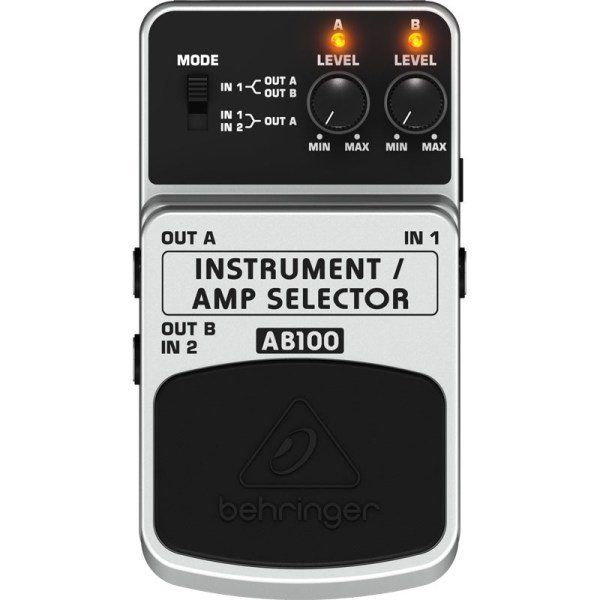 The Behringer AB100 footswitch features a primary INPUT, a dedicated OUTPUT and an additional output that can double as a second input. Just flip the MODE switch to determine whether you want to use two instruments through one amp or one instrument through two amps. With its two dedicated LEVEL dials, you can determine precisely the volume you want to send to each amp, or the level of the signals frrom your two instruments. A top-quality on/off switch ensures noise-free, instantaneous operation, and dual LED indicators show which inputs--or outputs--are activated. You can power the AB100 pedal with either a 9V battery or the PSU-SB DC power supply (not included).