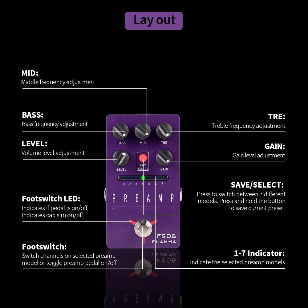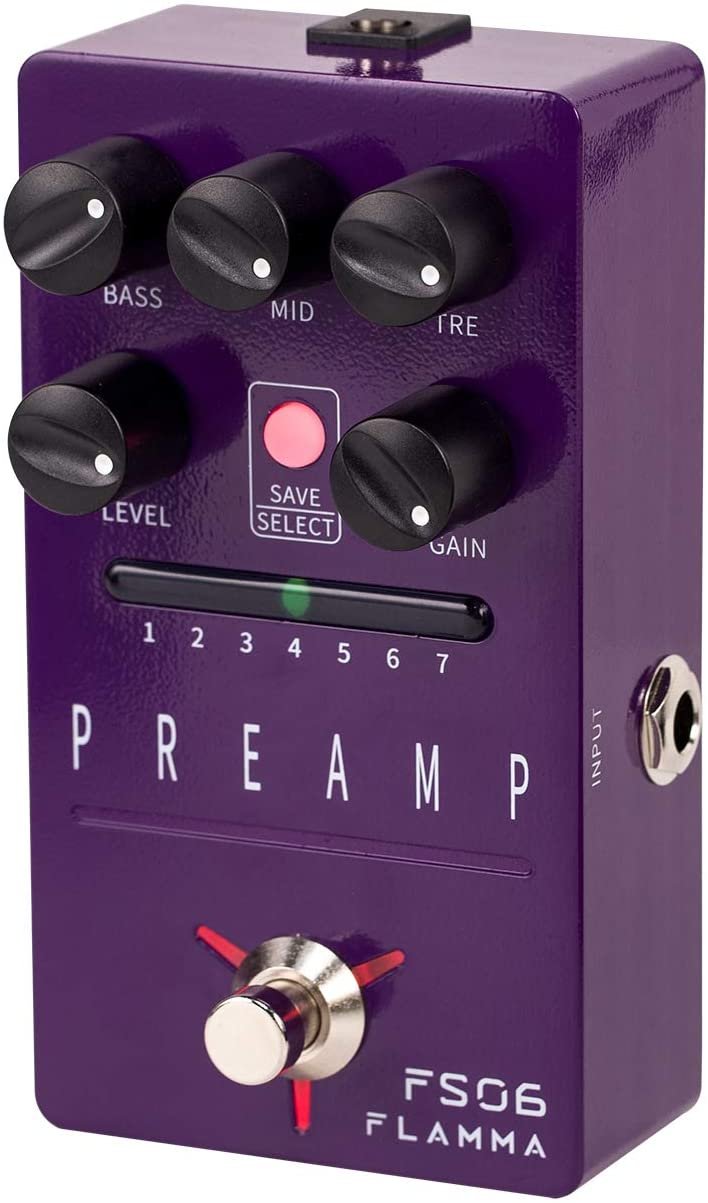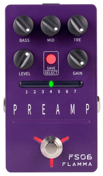 Flamma FS06; Guitar preamp with 7 different preamp models that cover a wide variety of classic and modern guitar tones; Preamp Models: Deluxe Blue, AC31, Coral Reef, Plex 50, Blue Eye 100, MB 5th Gen, HVE 5151; Each preamp model has two channels with preset save slot for each preamp; Built-in cabinet simulation allows users to connect directly to mixer/PA system; Footswitch can be used to switch channels or to toggle pedal ON/OFF; Power consumption: 9V, 300mA