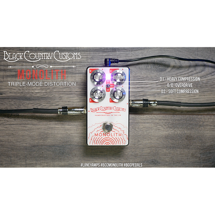 The Laney Black Country Customs Monolith puts an entire universe of distortion at your disposal. This triple-mode distortion effects pedal churns out the entire spectrum of distortion, from searing leads to fat power chords to jangly indie lines. You'll appreciate the touch dynamics of the Monolith; even when you crank the gain, it remains incredibly responsive to your pick attack. This harmonic-rich stompbox boasts a streamlined 4-knob layout with Distortion, Range, Volume, and Tone controls. The Monolith also features a tri-color LED for a clear visual reference to which mode you're using, along with dead-silent switching. Transparent buffered operation and a rock-solid metal housing round out the Monolith's many features. Guitarists hunting for a boutique-quality distortion pedal will find the Laney Monolith is out of this world.