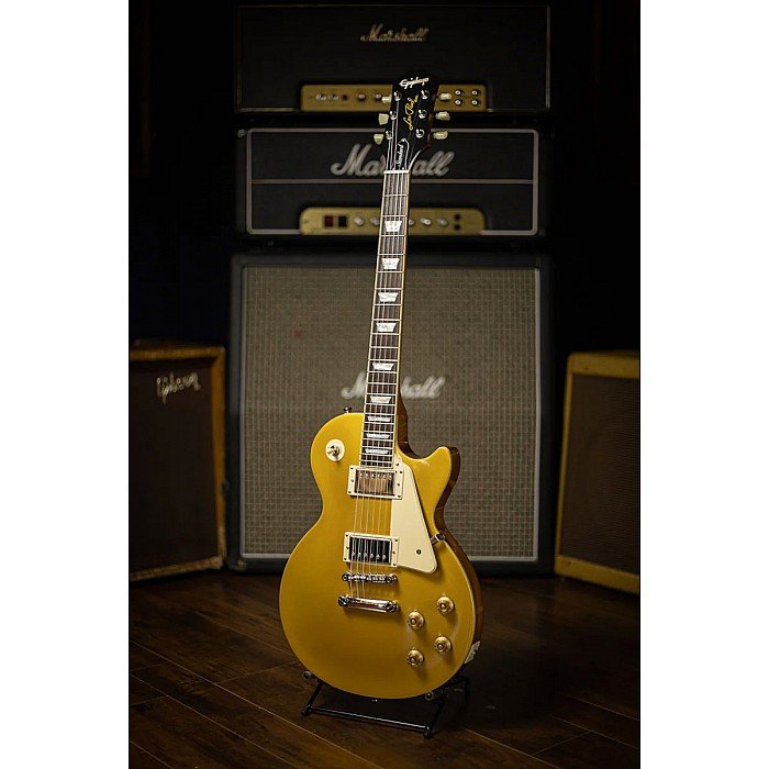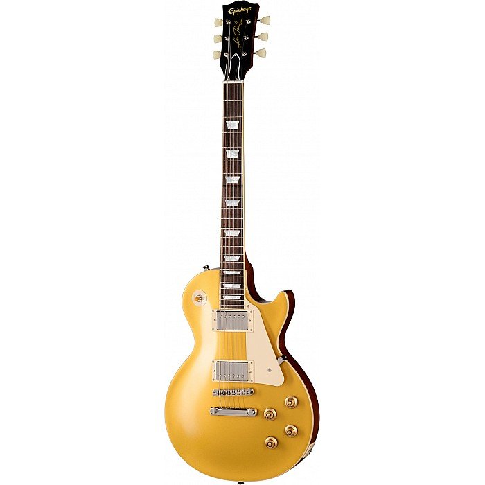 The bound rosewood fretboard is adorned with mother-of-pearl trapezoid inlays and equipped with 22 medium jumbo frets, just like the original models from 1957. It has an aged mother-of-pearl Epiphone logo and the words “Les Paul Model” silkscreened in gold on the Gibson-style “open book” headstock. Even the side dot position markers are the same size as on vintage 1957 Les Paul Standard models and are placed in historically accurate locations. The hardware is nickel-plated, including the ABR-1 Tune-O-Matic bridge, historical aluminum Stop Bar Tailpiece, and the Epiphone Deluxe “Single Ring” Keystone button tuners. A historic-inspired hardshell case with a Brown exterior and pink plush interior and Inspired by Gibson Custom Graphics is also included. The 1957 Les Paul Goldtop Reissue isn’t just a guitar; it’s a bridge to a symphony of possibilities, willing and ready to help you make your own mark on music history.