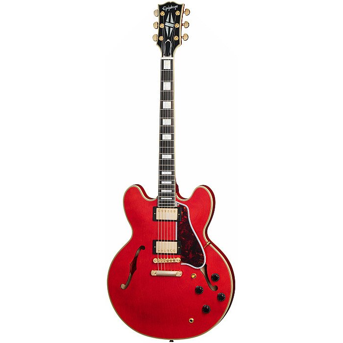 In partnership with Gibson Custom, Epiphone is proud to release the 1959 ES-355, a stunning recreation of the preeminent ES model from the legendary class of 1959. It’s the top-of-the-line ES model in all its glory, from the dimensions to the contours to the precise inlay patterns and sonic experience. The 1959 ES-355 features a 5-ply layered maple/poplar body with a solid maple centerblock for sustain and feedback resistance, a one-piece mahogany neck with a 50s Rounded Medium C profile, and an ebony fretboard that is adorned with block mother of pearl inlays. The Gibson-style “open book” headstock features the Split Diamond and Epiphone logo inlays in mother-of-pearl, along with gold Grover® Rotomatic® tuners and the Inspired by Gibson double diamond logo etched on the back. The 1959 ES-355 is powered by a pair of Gibson Custombuckers that are hand-wired to CTS potentiometers, Mallory capacitors, and a Switchcraft pickup selector switch and output jack. A brown and pink hardshell case with the Inspired by Gibson Custom logo is also included.