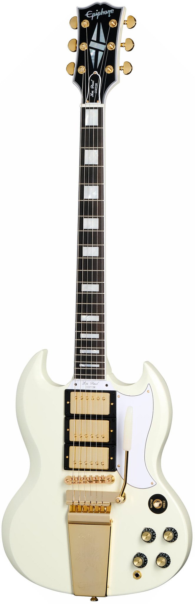 A majesty of performance since its arrival in 1961, the Epiphone SG has served as a decades-long weapon of choice for countless guitarists. This collaborative Custom Shop effort respects the legendary model's visual appeal and hardware — while adding a bounty of under-the-hood enhancements for discerning modern players. A solid mahogany top and body represent the pinnacle of SG design, culminating in a classic white set mahogany neck, complete with onboard fretboard inlays for visual authenticity. The 1963 SG Custom further features a trio of Gibson's CustomBucker pickups, along with two volume and two tone knobs, and a 3-way Switchcraft toggle for imperative tone sculpting. As Sweetwater guitarists know all too well, sourcing a real-deal ’60s SG can be a difficult task — thankfully, the 1963 SG Custom is a dutiful replication of its entirety, harboring zero of the hassle.