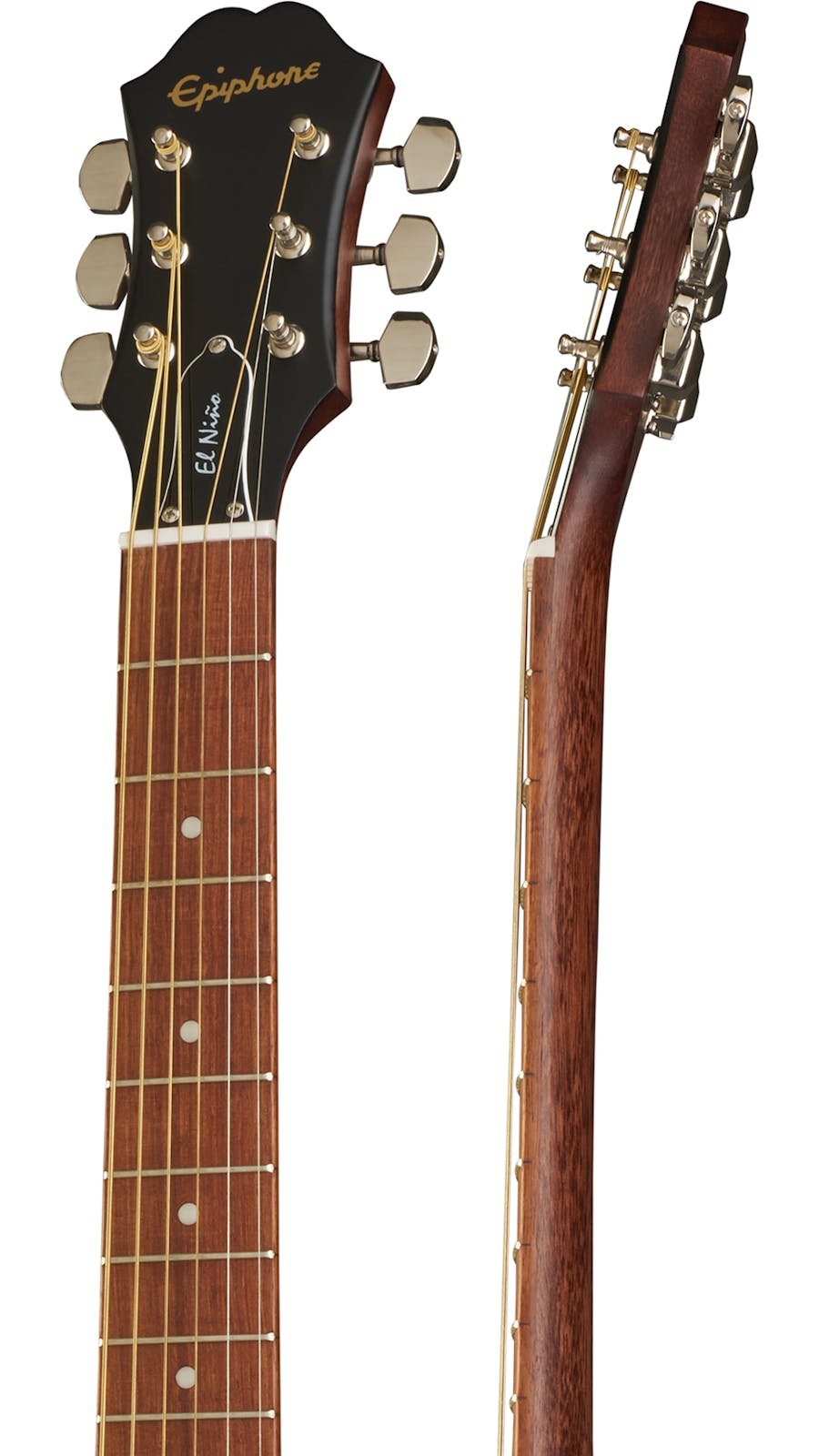 The El Nino has fine Epiphone appointments that both beginner and more seasoned players will appreciate. A reverse-belly granadillo bridge with compensated saddle offers great tone support, and genuine nickel hardware and easy-to-tune Epiphone covered machine heads add to the pleasurable playing experience.