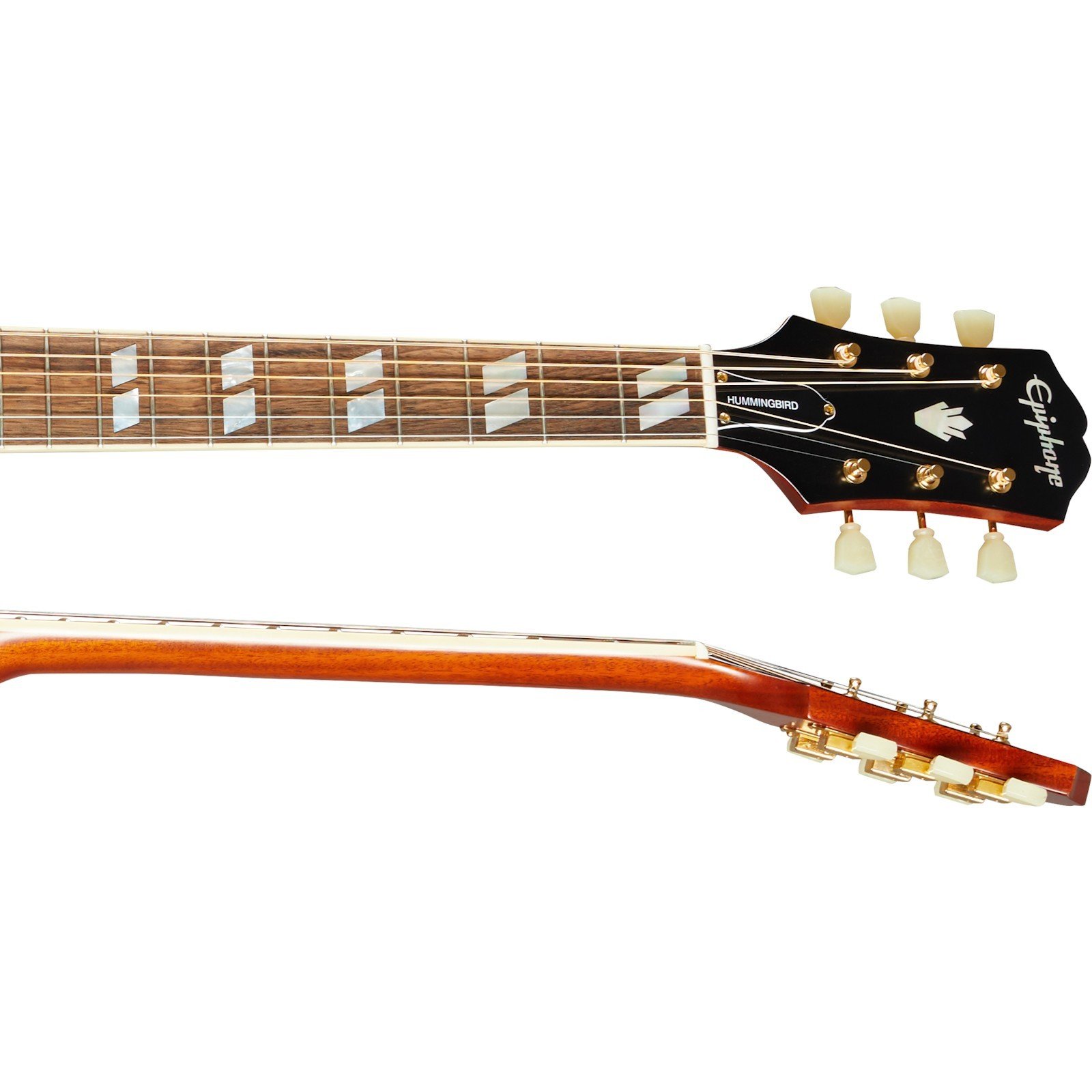 The ultra-comfortable rounded "C"-profile neck on the Epiphone Hummingbird has been glued in and features a tapered dovetail neck joint. Antique ivory binding along the neck and vintage mother-of-pearl split parallelograms on the fingerboard add even more classic visual details that will delight. The Indian laurel fingerboard is incredibly smooth and responsive — it will leave you with no doubt as to why the original it was inspired by has won over a legion of guitarists.