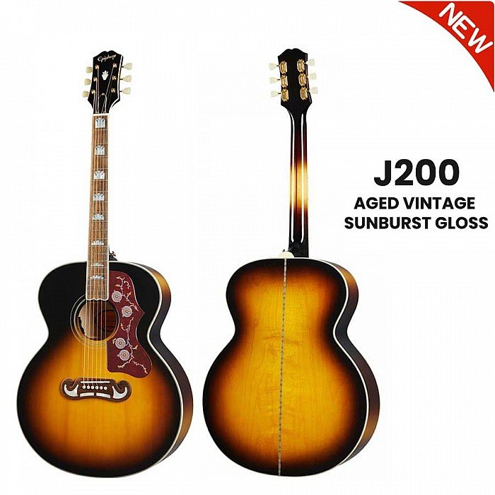 Since its introduction in 1937 it has been the choice of "singing cowboys" like Tex Ritter and Gene Autry, as well as folk, rock and country royalty, including Emmylou Harris, Elvis, Jimmy Page, Bob Dylan, George Harrison, The Edge, and many more. Featuring a Super Jumbo non-cutaway solid figured maple body, solid Sitka spruce top, and two-piece maple neck with a mahogany center strip, the Epiphone J-200 is built with all solid woods for outstanding tone.