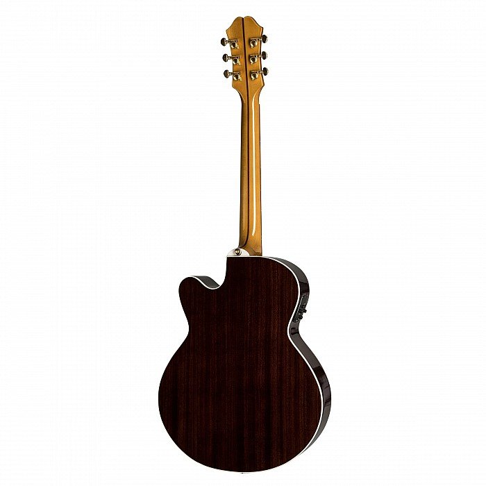 The Epiphone EJ-200SCE's fingerboard is made of high-grade pau ferro. This durable wood's resilience makes the fingerboard extremely balanced and stable, and gives each chord and note exceptional clarity and bite. What's more, the EJ-200SCE's pearloid graduated crown inlays are inserted into the fingerboard using a special process that eliminates gaps and doesn't require fillers. The fingerboard is bound for an extremely smooth and comfortable feel that enhances the J-200 Standard's playability.