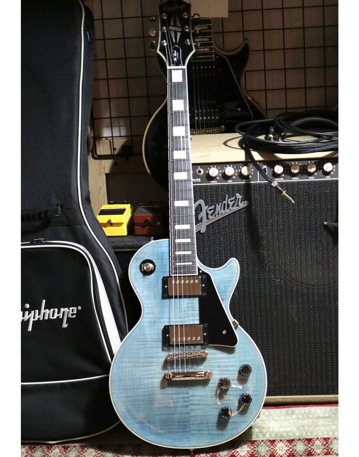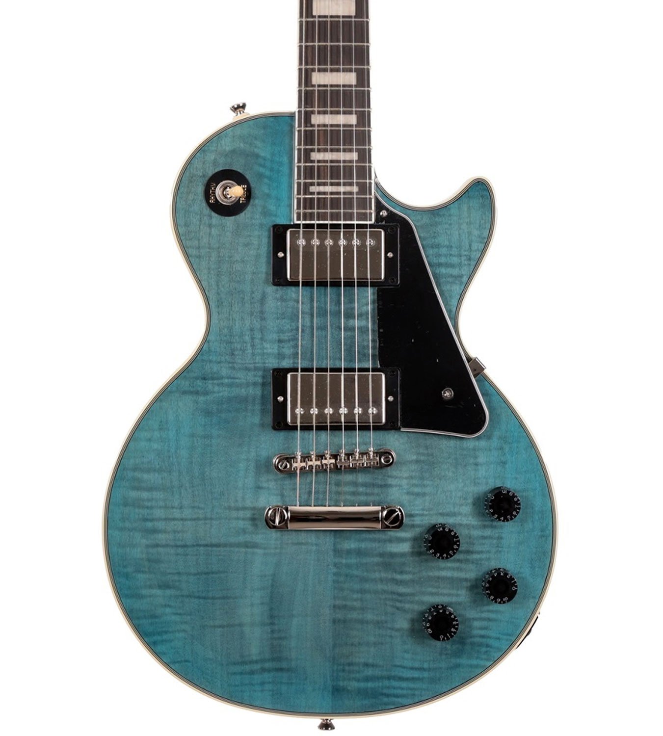 This Les Paul Custom honors the 1950s classic designed by Mr. Les Paul in 1954 with a stunning figured maple top and vibrant finish. Featuring a traditional Custom-style Mahogany body and Ebony fingerboard, chrome hardware, critically acclaimed ProBucker humbuckers, and Custom-style inlay. This is a limited edition Epiphone Les Paul Custom Figured in Transparent Blue. Inspired by Gibson's famous Les Paul Custom, this Epiphone Les Paul is elegantly dressed with split diamond headstock inlays, an ebony fingerboard, block inlays and multi-ply binding. Equipped with a set of ProBucker pickups and expertly finished in a beautiful Transparent Blue lacquer on a AAA maple top, this guitar looks as good as it sounds. An electric guitar that can do it all and is a worthy addition to any collection!