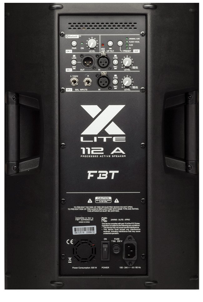 The FBT X-LITE 112A is two way design incorporating a 12” low frequency woofer and 1” HF compression driver coupled to a 90°H x 60°V constant directivity horn. With a frequency range of 50Hz - 20kHz the FBT X-LITE 112A speaker provide high fidelity sound for both speech and music applications with a maximum SPL of 129dB. The bi-amplified FBT XLITE 112A active speaker feature a 1200W low frequency amp and a 300W high frequency amp.  The control panel features a three-channel mixer with two micro-line inputs, a stereo input and a dedicated channel for bluetooth 5.0; two xlr inputs, stereo input, xlr output with ch1 or mix link selector, hp filter, two mic-line selectors, dsp preset selector, bluetooth 5.0 with pairing led. 4 x M10 rigging points built-in into the cabinet along with the optional mounting brackets allow the FBT XLITE 112A speaker to be surface mounted on walls or ceilings.