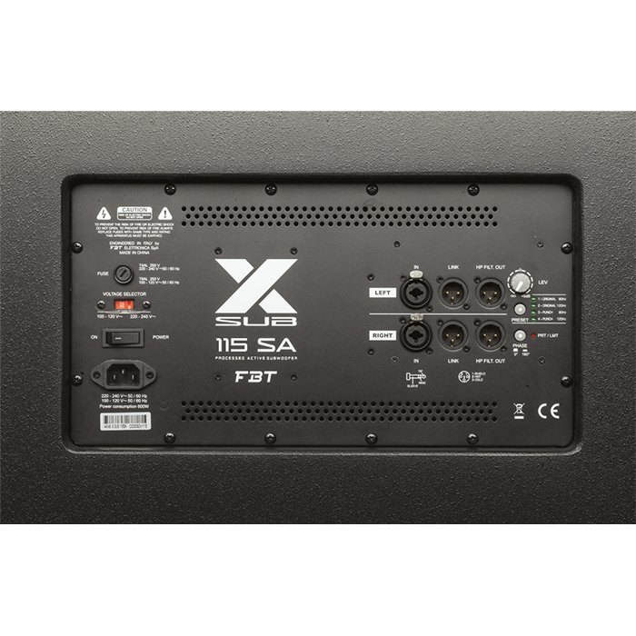 The FBT X-SUB 115SA , 1 x 15" bass-reflex design subwoofer, is the perfect low frequency extension and the ideal companion for the FBT X-LITE and FBT X-PRO series. Frequency response of 42Hz to 120Hz @ -6dB, maximum SPL of 135 dB peak, 1200W Class D amplifier. Equipped with a 15\" (380mm) high excursion woofer and a 1200W RMS internal amplifier. It has a digital signal processor with 4 presets, allowing extensive customisation of low frequencies up to mid-high levels.