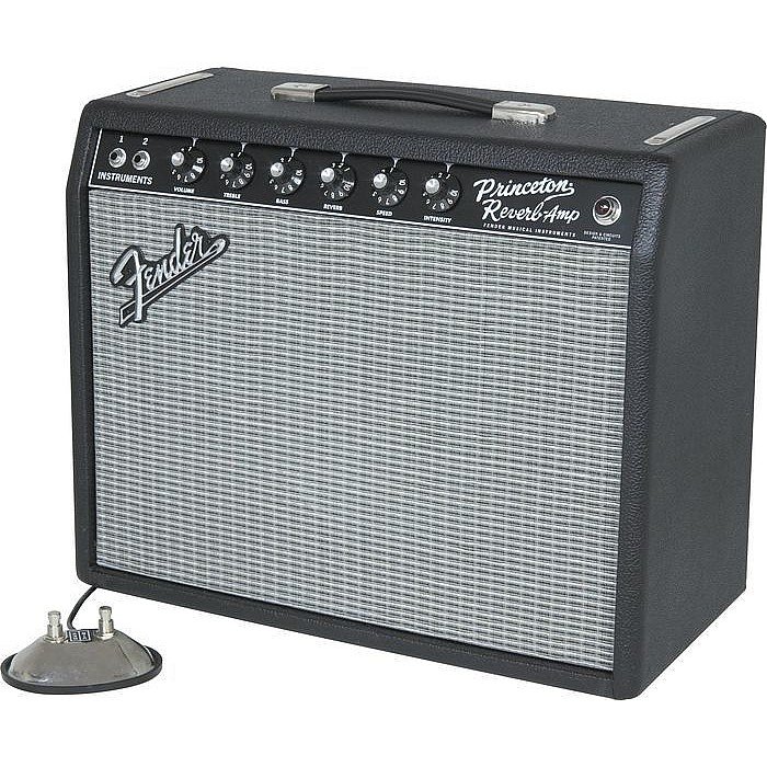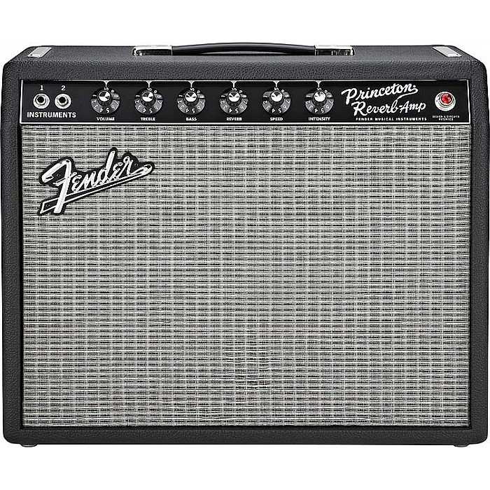 The Fender '65 Princeton Reverb Amp is an authentic all-tube reproduction of the original classic! The Princeton Reverb amplifier delivers 15W through one 10" Jensen Special Design speaker. This single-channel amplifier favorite has 2 inputs, reverb and vibrato effects with an included footswitch, and control knobs for Treble, Bass, Reverb, Speed, and Intensity. The tube complement consists of a trio of 12AX7s, a 12AT7, dual Groove Tubes 6V6s, and a single 5AR4 rectifier tube. The Fender Priceton Reverb combo is covered with tough vinyl, and Fender ships the reverb amp with a vinyl dust cover.