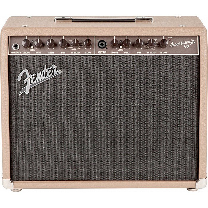 The Fender Acoustasonic 90 is perfect for the acoustic guitarist who needs compact, powerful and affordable amplification. With its 90-watt power amp, 8" cloth-surround low-frequency woofer and high-frequency tweeter, it packs stage-worthy performance into a lightweight combo weighing only 18 lbs.