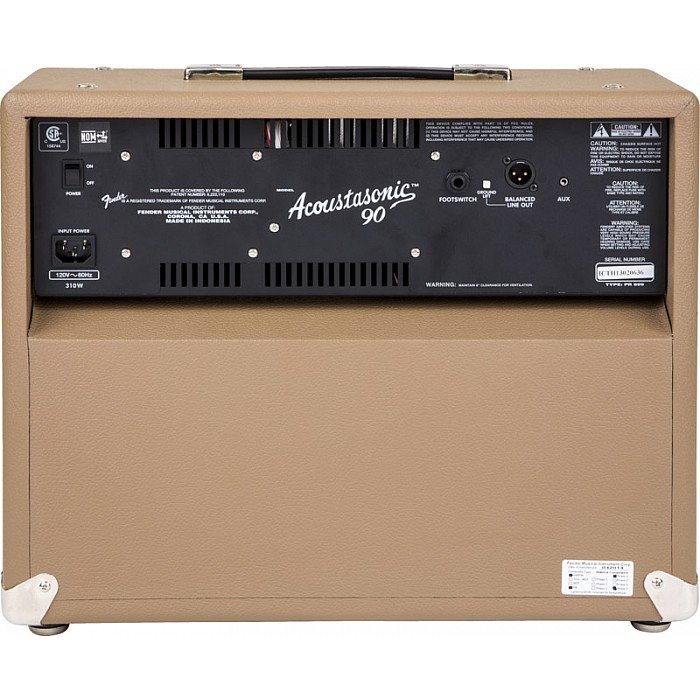 The Acoustasonic 90 also delivers a wealth of other versatile features, including instrument and microphone channels with independent tone and effects controls; smart feedback elimination circuit with on/off switch for each channel; studio-quality effects including reverb, echo/delay, chorus, Vibratone and more; XLR line output with ground lift; auxiliary input external media player use; strong but lightweight five-ply hardwood construction; and a classic Fender look with brown textured vinyl covering, black grille cloth and chrome hardware.