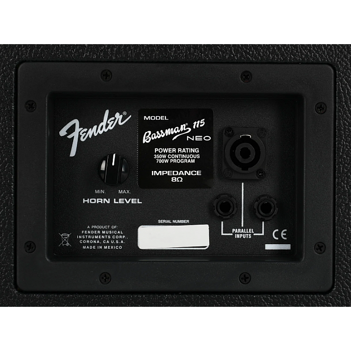 Fender's Bassman 115 Neo bass cab is loaded with a Fender Special Design Eminence Neodymium 15-inch speaker. Neodymium drivers are extremely efficient and give you significant weight savings. Combined with a compression driver horn tweeter, you get the whole tonal gamut, from warm, classic Fender bass sounds to more aggressive, modern bass tones.