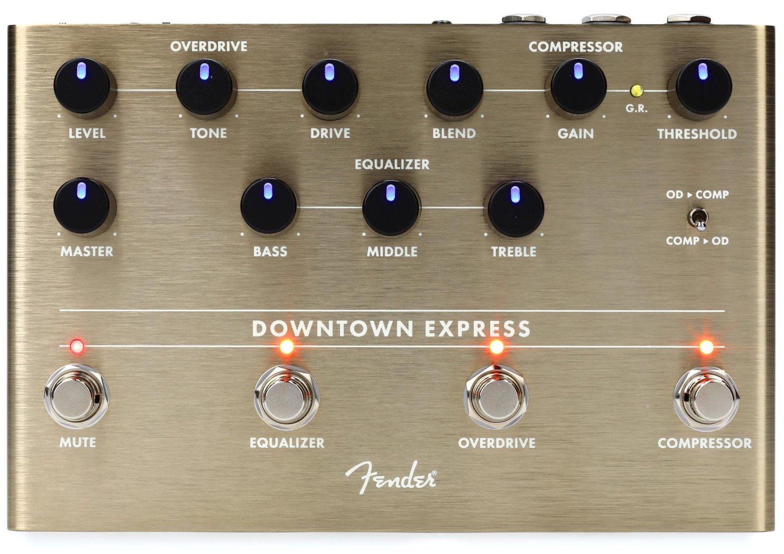 Your one-stop shop for bass tone-shaping, the Downtown Express bass multi-effect puts everything you need for killer bass tone right at your feet. All the bass essentials are there—compressor, 3-band EQ and overdrive—each switchable on its own, or you can use the Mute switch to kill the signal for silent tuning. The Direct Output makes it easy to integrate this pedal into any performance situation—stage or studio. We recognize that a truly powerful signal chain needs to be flexible, so we included a switch that lets you reorder the compressor and overdrive circuits to taste.