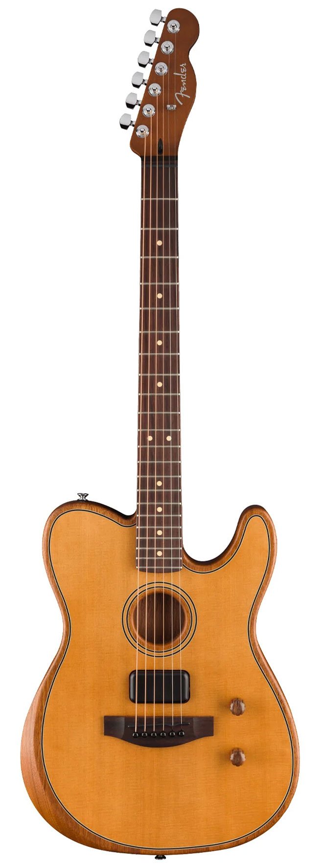 Combining revolutionary acoustic architecture, state-of-the art electronics and legendary Fender® electric guitar designs, the Acoustasonic® family of instruments embodies the spirit of purposeful innovation that Fender was built on. The dual personality of the Acoustasonic Standard Telecaster® equips players with a versatile spectrum of acoustic and electric tones in a single creative tool. With a braced solid Sitka spruce top, fully chambered body, inventive Fender and Fishman®-designed analog electronics with volume and blend control, and the familiar playing feel of a Fender icon, this Tele® truly sets the standard for the Acoustasonic experience.