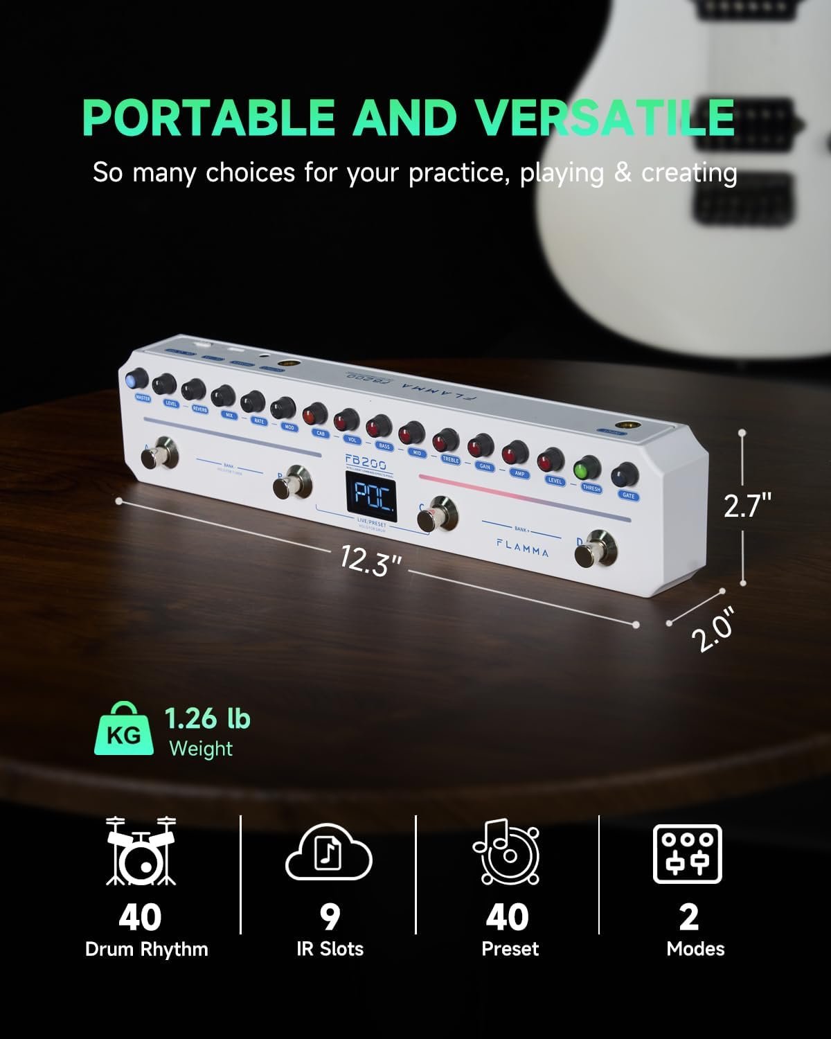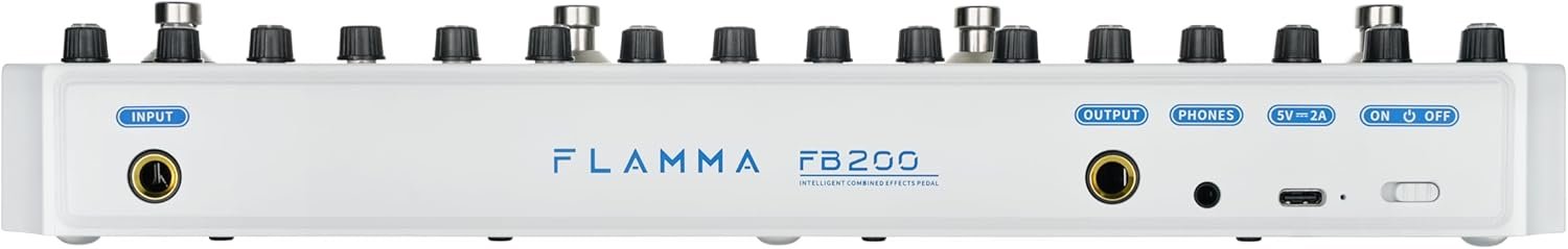It’s certainly convenient that the device comes preloaded with these amp and cabinet sims, but to provide added versatility, it also supports third-party impulse response loading across 9 additional loading slots. It is even compatible with the FLAMMA app, allowing users to share and download tones and presets through the cloud. The FB200 strikes a balance between portability and practicality. Measuring 311 × 67.5 × 49.7 mm and weighing just over half a kilogram (578 g), it is compact enough to slip into a gig bag pocket yet large enough to provide four multi-purpose footswitches and a generous panel of 16 control knobs. The top surface includes a three-character LED display, which may not win awards for visual clarity but gets the job done when navigating presets or adjusting parameters on the fly.