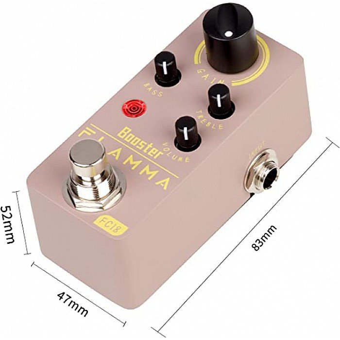 The FC18 is an ultra-compact booster pedal with 20db+ clean pulse with 2-band equalizer of ± 15db, nice beautification of the original tone. A true high-quality bypass circuit amplifies your signal without degradation or alteration. Looking for that extra bit of oomph in your tone? The FC18 Clean Boost pedal offers up a 20db+ clean boost with a 2 band EQ that allows rich tonal enhancements in a compact package. The large gain knob lets you easily adjust your levels on the fly while the mini bass/treble EQ knobs allow for more fine tweaking of volume levels and tone color.