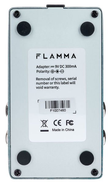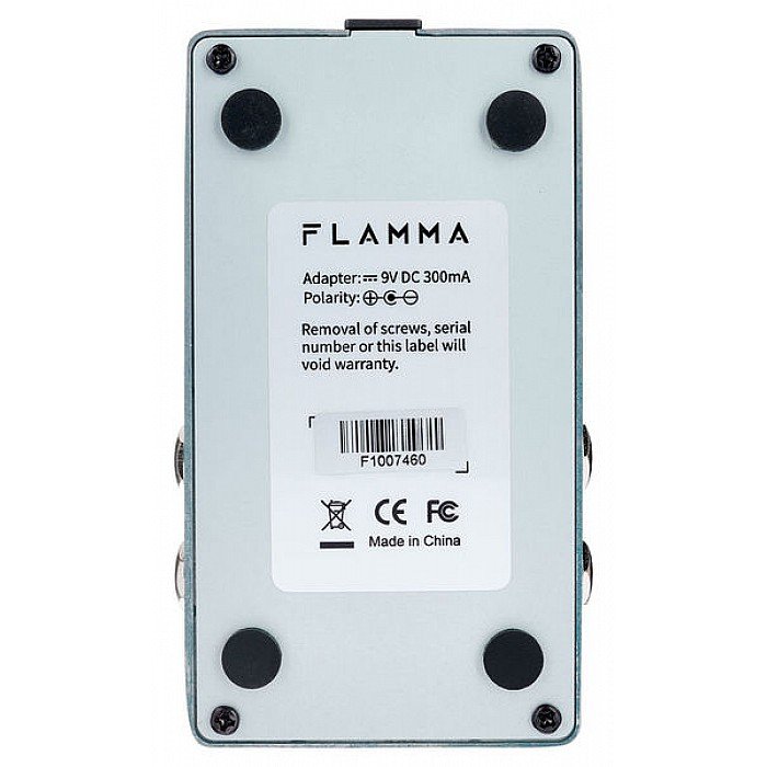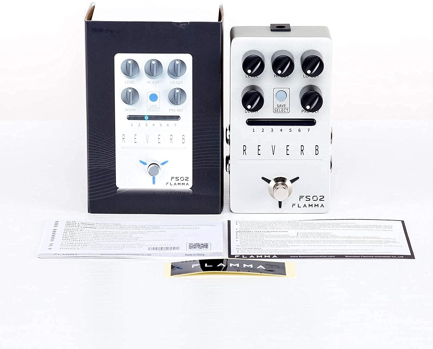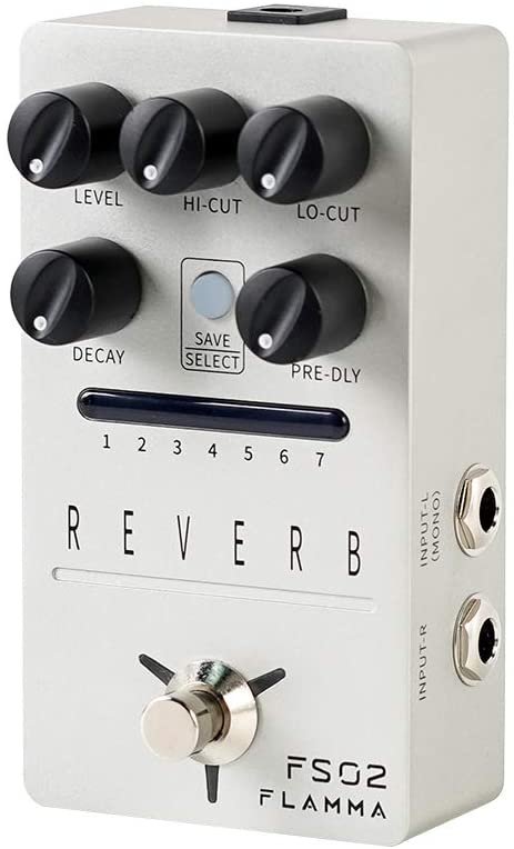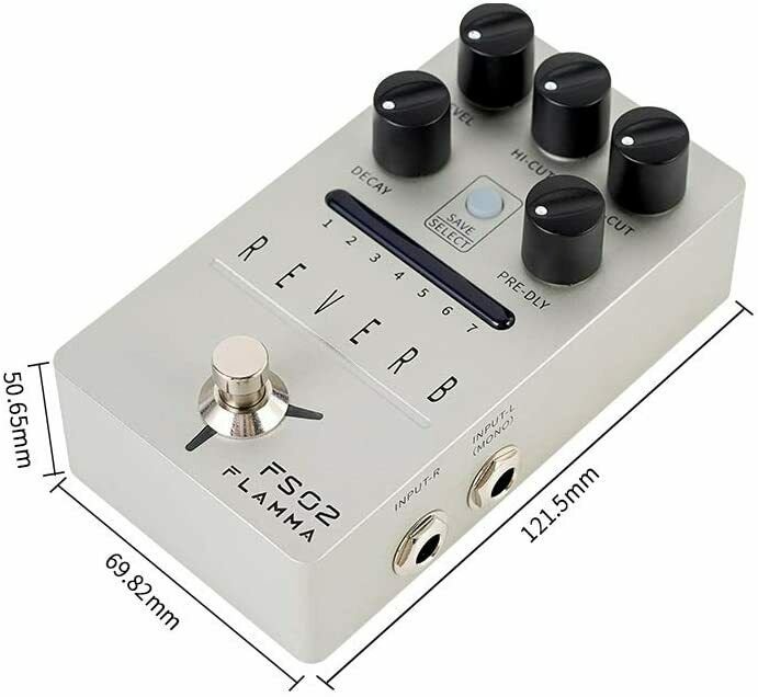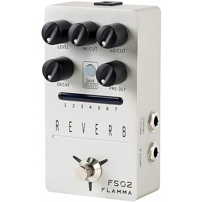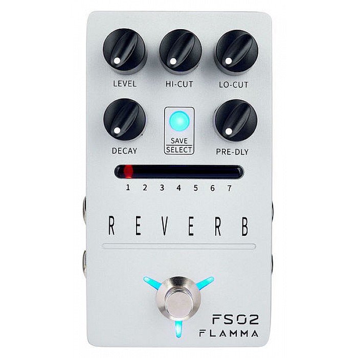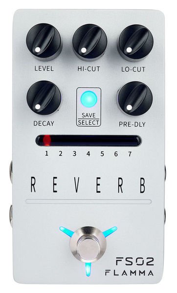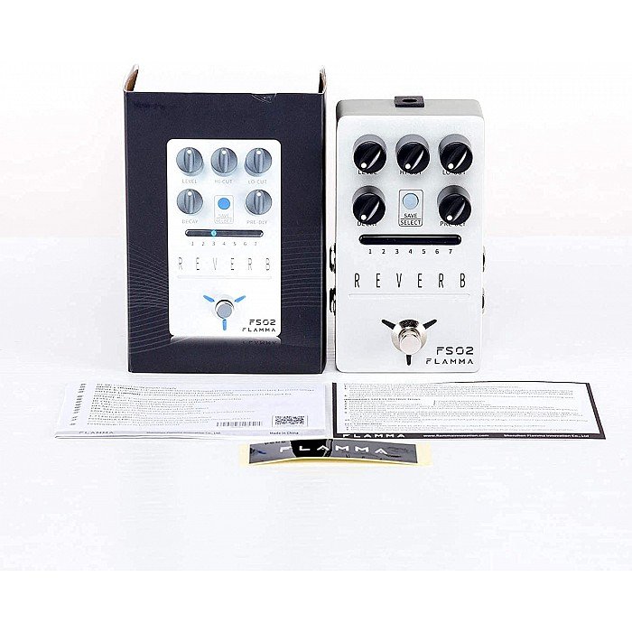 Flamma FS02; Reverb pedal with 7 classic reverb effects; High-quality stereo input and output; Storable preset slot for each effect; Trail On function allows effects to fade out naturally; True bypass reduces signal loss; Power consumption: 9V, 300mA.