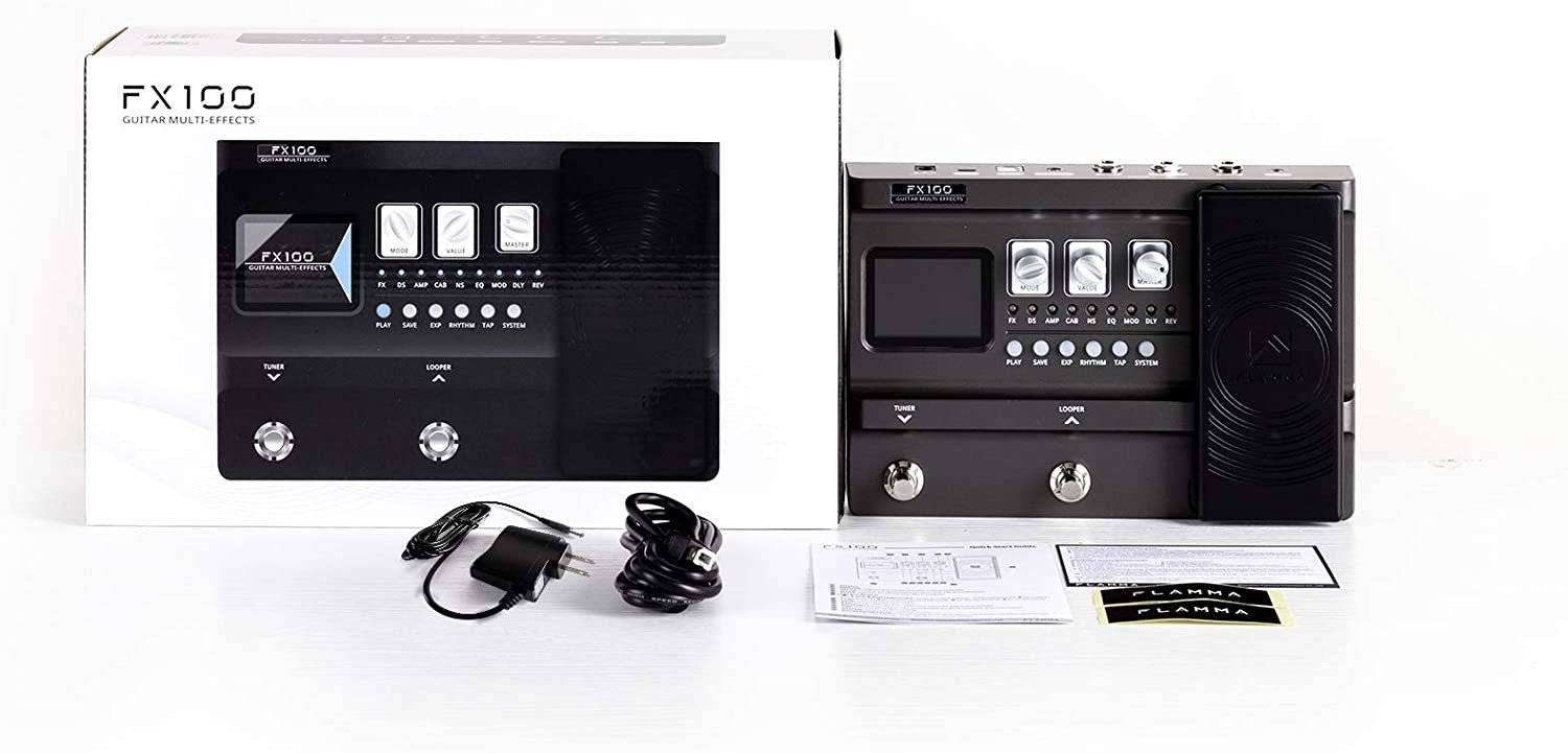 Flamma FX100; Multi-FX pedal for guitar with 55 classic & modern high-quality guit ar AMP models that giving a real tube amp tone, feel & response; Up to 9 effect types for 151 different effects total; 26 user slots to load in your favorite 3rd party IR files; 200 preset patches; Tap Tempo function; Expression pedal allows you to control multiple values by one touch; USB connectivity for PC editing and direct audio recording to computer; Fully functioning LOOPER with 80 seconds capacity; Headphone output for silent practice; Auxiliary audio input; 40 drum rhythms and 10 metronome options; OTG function supports smart phone recording; Power consumption: 9V, 300mA, separate power supply included.