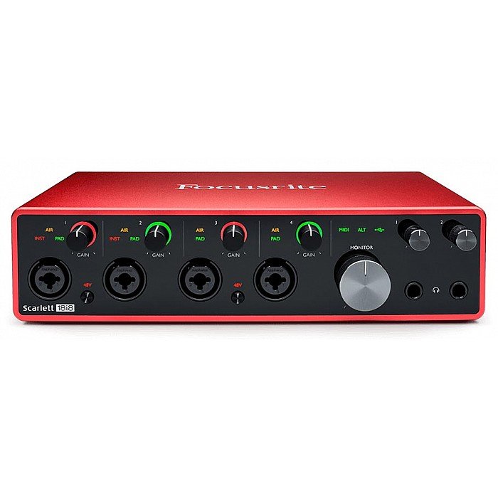 The Focusrite Scarlett 18i8 3rd Gen is an 18-input, 8-output USB audio interface that offers the flexibility to adapt to any recording environment. With four console-grade preamps, eight balanced line-level inputs, and four dedicated monitor outputs, no session is too big for the Scarlett 18i8.
