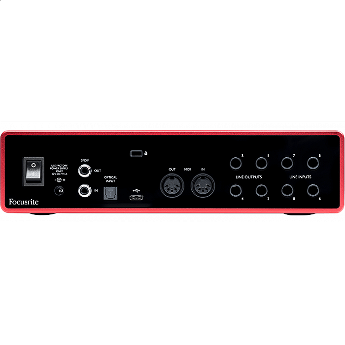 The new Scarlett 18i8 is equipped with state-of-the-art 24-bit/192 kHz digital audio converters for the highest possible sound quality while recording and mixing. Check your mixes on multiple monitoring systems using four analog outputs with speaker switching technology for dual monitor setups. Or use the second set of outputs to add some analog signal processing to your mix bus for that classic studio sound.