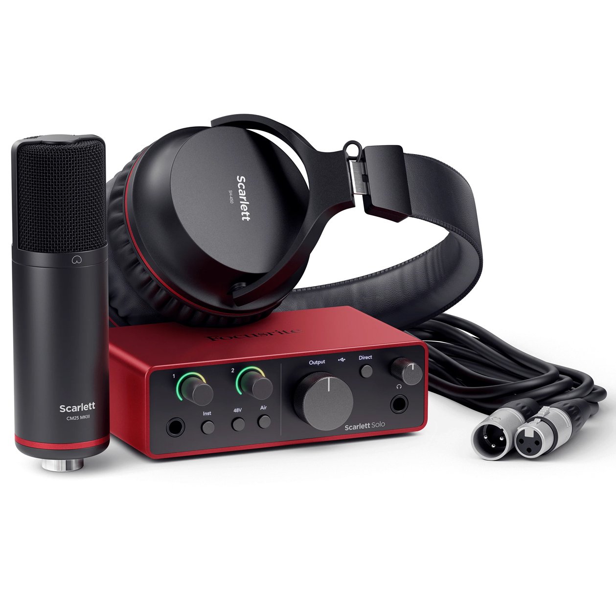 The Focusrite Scarlett Solo Studio provides songwriters with everything they need to create high-quality recordings. This bundle is built around a 4th-generation Focusrite Scarlett Solo audio interface. The included CM25 MkIII condenser microphone yields a bright, detailed character that sounds good on any source, especially when paired with the Solo's crystal-clear mic pre. You get SH-450 closed-back headphones, which make the most out of the Solo's custom-designed headphone amplifier. You also get an XLR microphone cable and a useful array of free software to get you up and running fast. Recording songwriters and musicians searching for an effective all-in-one recording bundle will be mightily pleased with the Focusrite Scarlett Solo Studio. The 4th-gen Focusrite Scarlett Solo gives songwriters plenty of reasons to upgrade their previous-generation interface, such as an updated mic preamp, RedNet-derived AD/DA conversion, Auto Gain and Clip Safe features, Dynamic Gain Halos, and more.