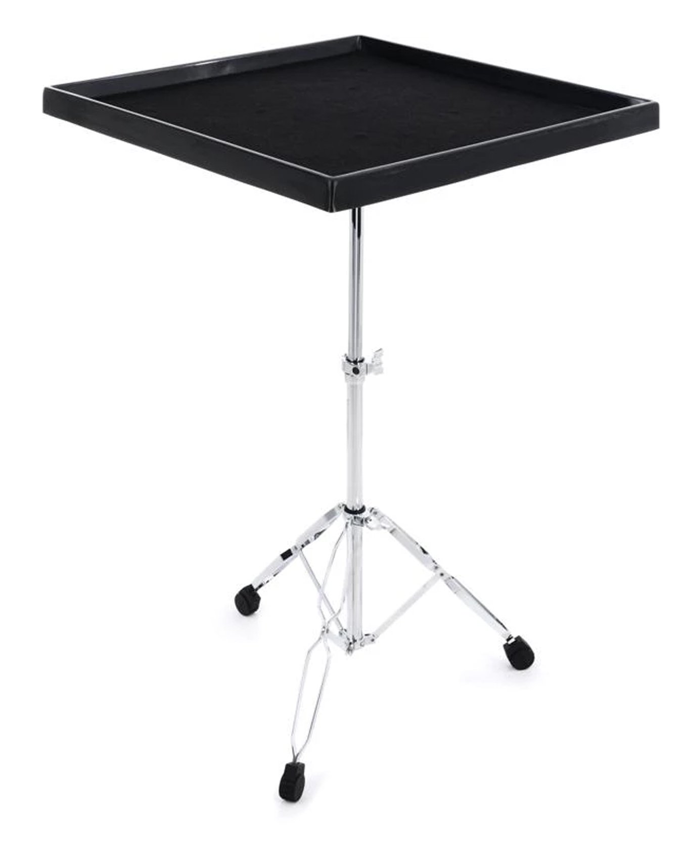 Auxiliary percussionist to trap set players, electronic musicians to remote mix engineers, folks in the audio industry always seem to find a need for the Gibraltar 7615 percussion table. The large 24" x 24" cloth-covered fiberglass tabletop is the perfect place to perch your percussion toys, laptop, mixing board, or field recorder. The 7615 sits on sturdy double-braced metal legs with rubber feet for no-joke stability and security, indoors and out. A 29"–39.5" height adjustment suits this percussion table to a wide range of tech and player needs.