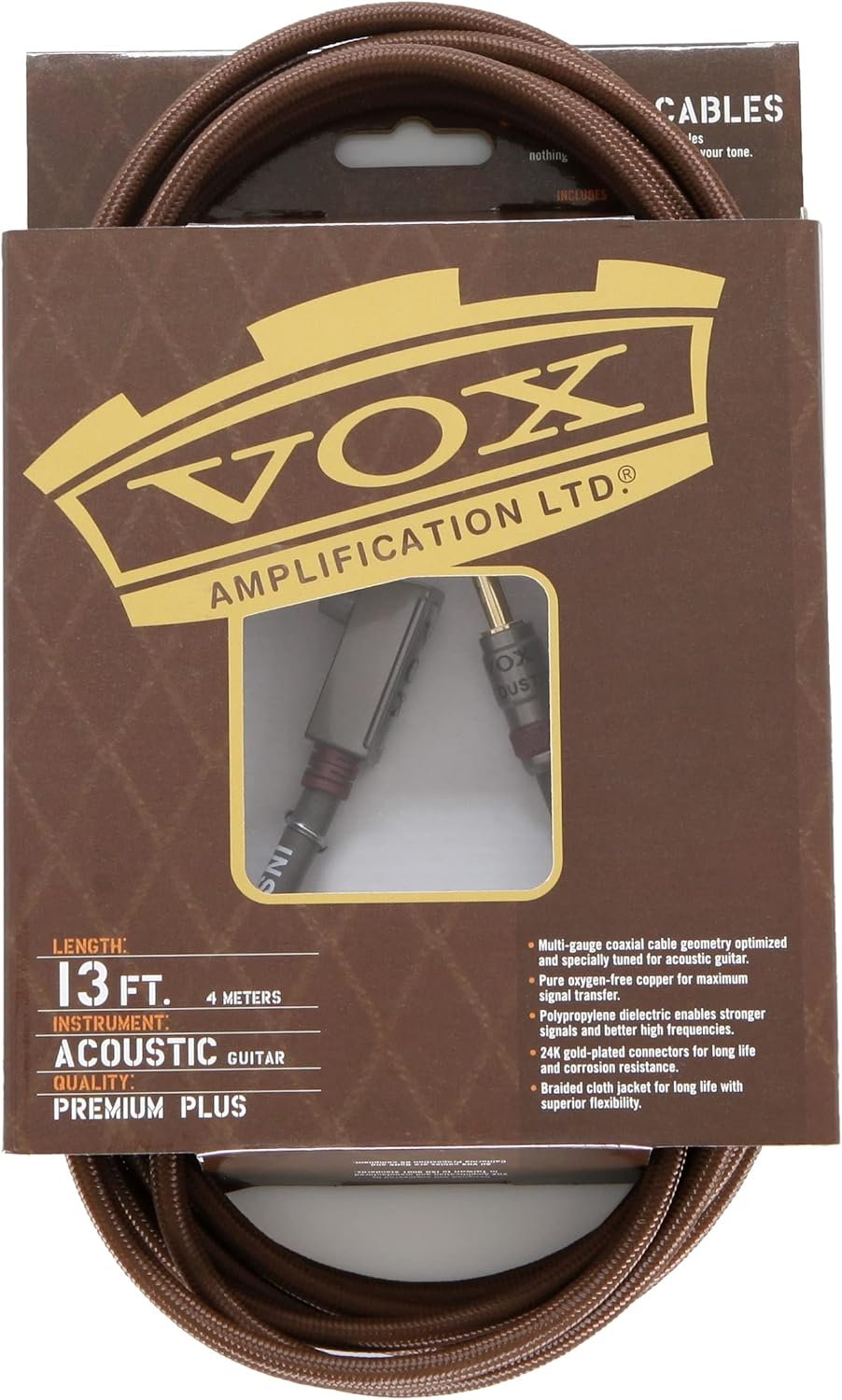 Standard guitar/speaker cables compromise performance by using lower grade conventional copper conductors. This can result in signal loss and distortion that cause lower definition, poor dynamics and inaccurate sound. VOX Class A cables use high grade oxygen-free copper cable conductors that yield better clarity and a more natural sounding midrange. The stranded construction has been carefully selected and tuned using the optimum strand gauge and strand count to give the maximum performance for the instrument applications specific to each cable. A precision formulated, polypropylene dielectric material results in stronger signals that yield better high frequencies, and more realistic tonality and nuance.