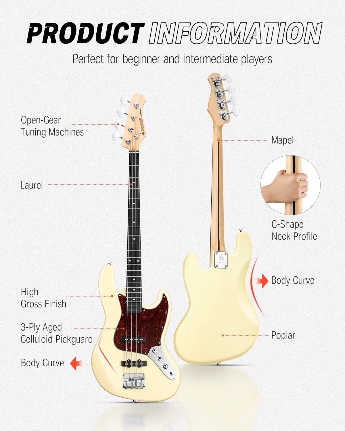 Equipped with a pair of Ceramic Single Coil Jazz Bass pickups. With custom tuning from Donner's engineering team, this bass guitar produces a clear, crisp tone with good low end depth, punch, and sustain.