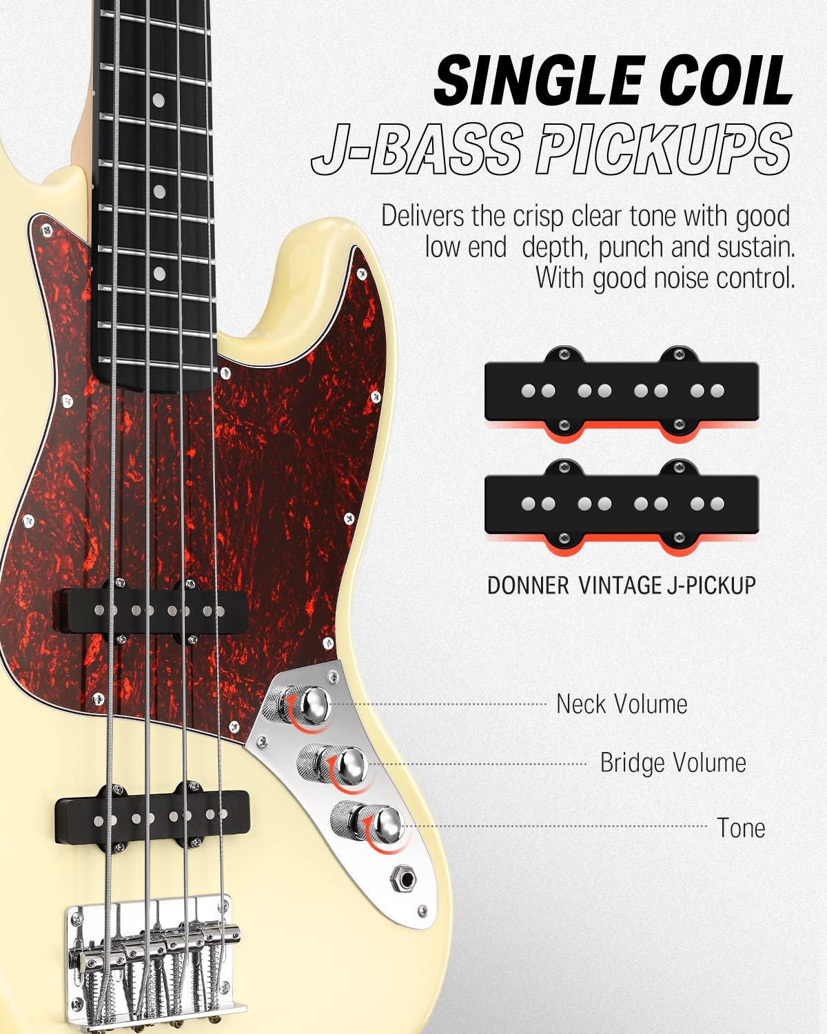 The Donner DJB-100 offers a classic circuit setup. 3 chrome knobs included: 2 individual volume control knobs for each pickup, and a master tone control knob, you'll get the exact sound you need. Produces crisp, clear tones with good low end depth, punch and sustain. With good noise control, but also to ensure no loss of bass and treble, pure classic J-Bass tone.