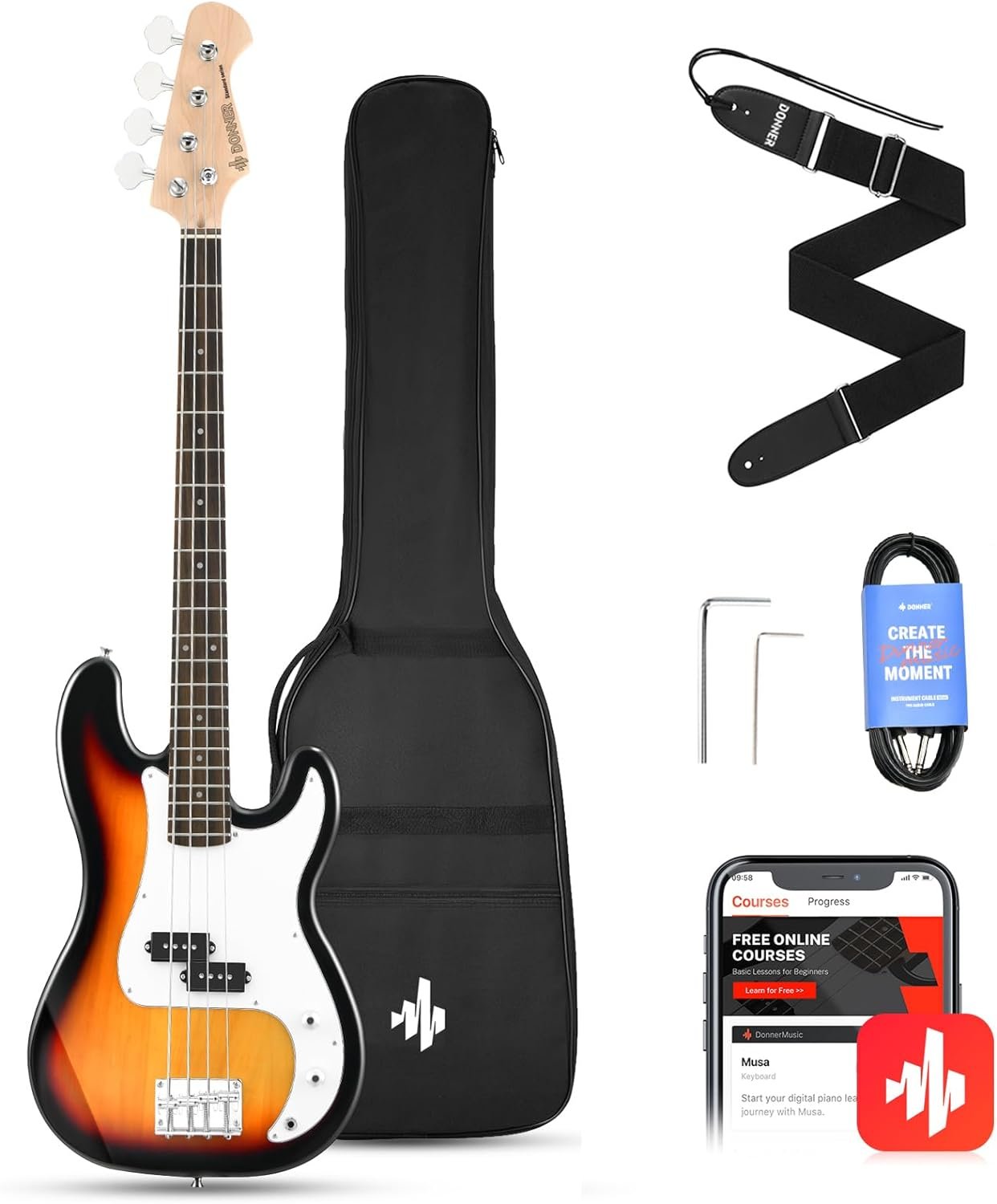 Donner electric bass with AAA purpleheart fingerboard, AAA Canadian maple neck with superior finish on the back of the neck provides a smooth fret-hand feel and combines comfort and performance, quality materials enhance your playing comfort. With a “Modern C” shaped profile, it is suitable for a variety of playing styles. Donner PB-Style 4 Strings Bass comes with all the accessories you need: bag, guitar strap, and guitar cable as a gift. You can play your Donner bass right away when you get it.