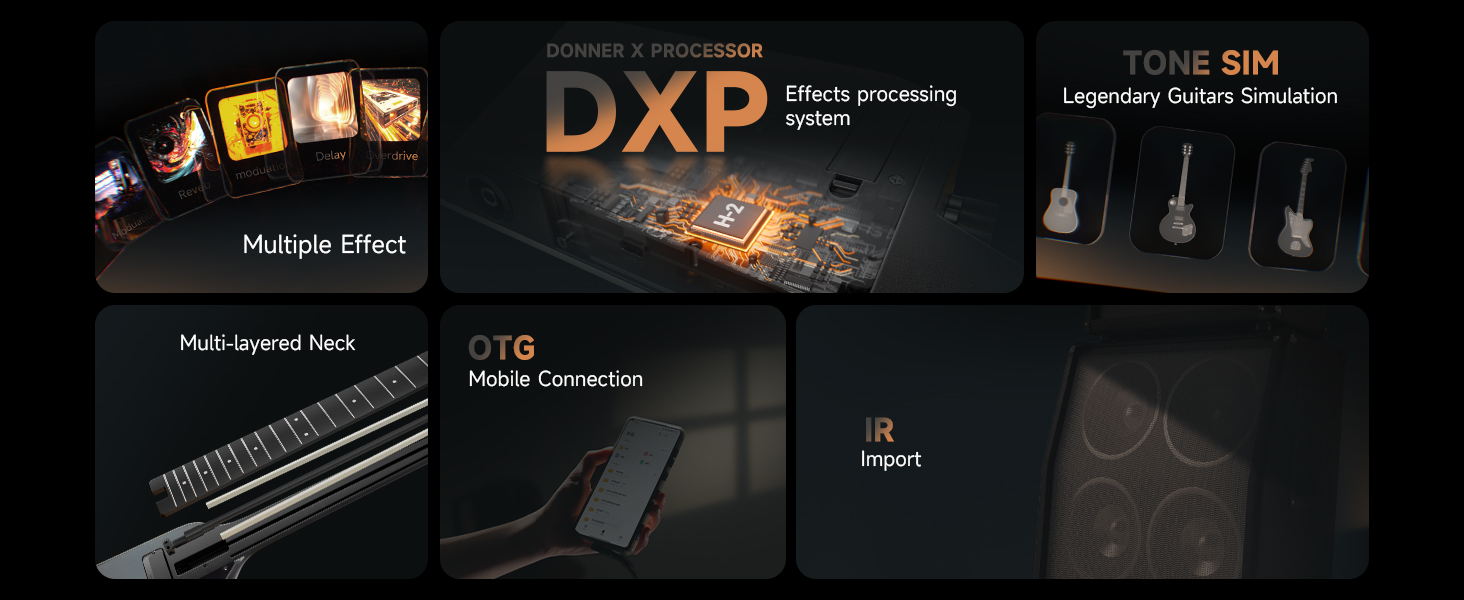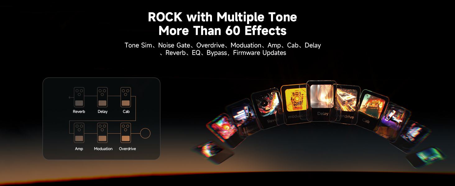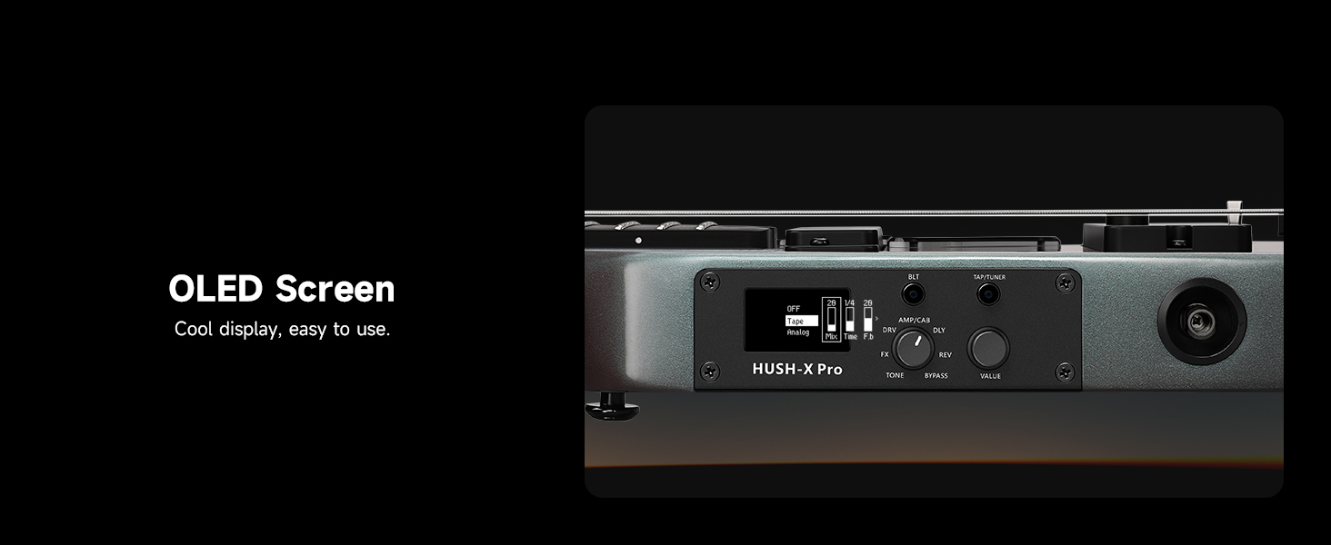 • Tone Sim - With 4 electric guitar tones and 3 acoustic guitar tones sampled from authentic sources, the HUSH X PRO offers 7 distinct tone simulations. The portable guitar seamlessly combines the unique tones of multiple guitars with versatile effects, delivering unparalleled musical diversity and convenience