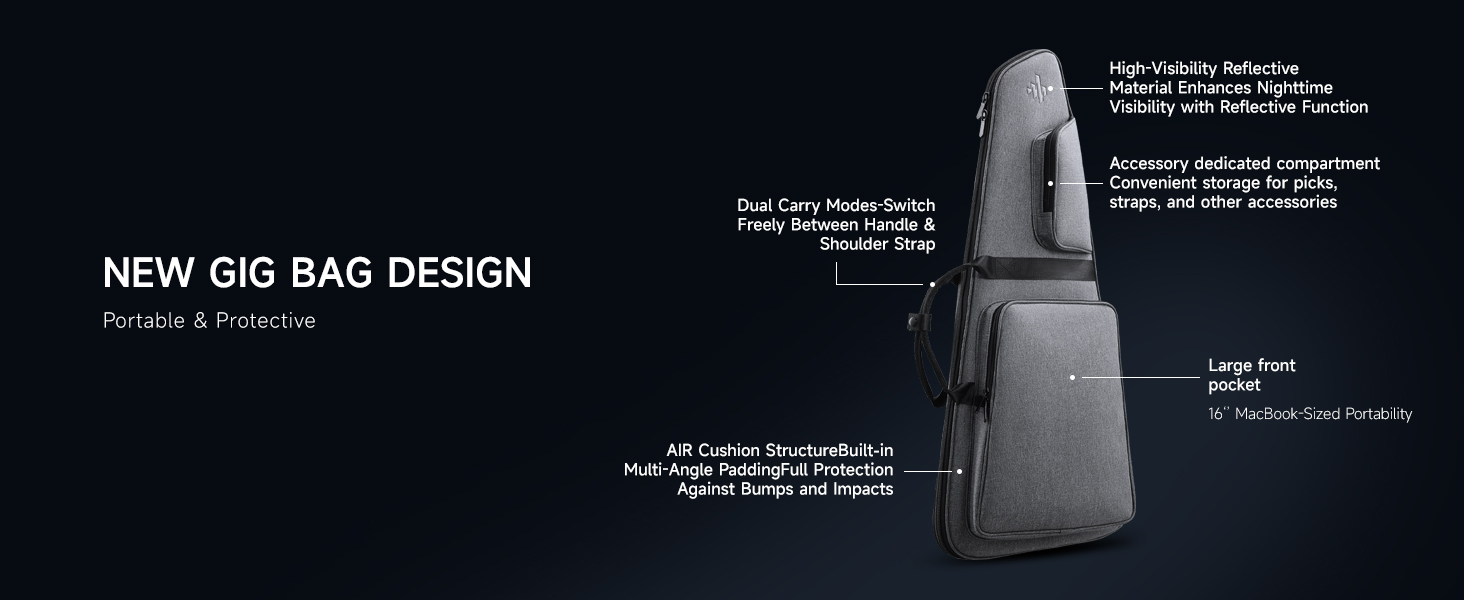 14. Comes with a lightweight, shock-absorbing gig bag featuring reflective safety accents, convertible carry modes (handheld or backpack), and spacious front pockets for accessories and devices.