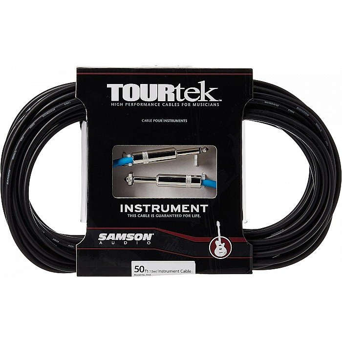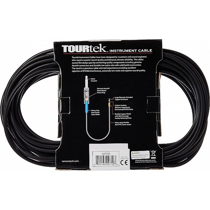 Samson TI50 50′ Tourtek Instrument Cable is designed for musicians and sound engineers who require superior sound quality and demand ultimate reliability. The cable feature inner stranded copper conductors covered by a PVC insulator, which is wrapped in a second carbon insulator, then wrapped in a braided copper shield with 96% coverage. This is protected by a 6 mm PVC outer jacket. The low capacitance cable provides excellent rejection of RFI/EMI interference, extremely low handling noise and superior sound quality.